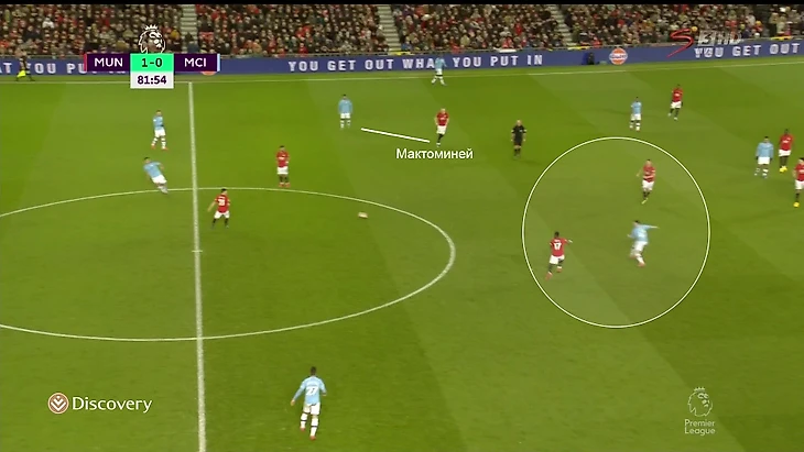 Типичная ситуация: Мактоминей против Гюндогана, а против Фодена все равно остается пара Матич-Фред. Контролируют и центр, и движения полузащитника «Сити». Помощь защитников больше не нужна – линия сохраняет цельность: