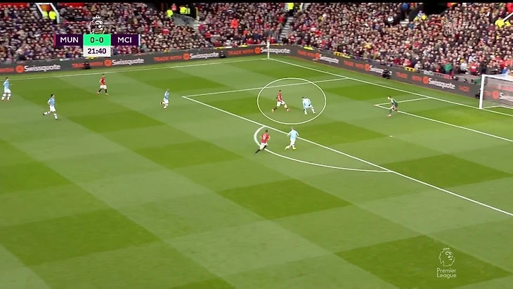 4. При прессинге «Юнайтед» играл персонально по всему полю. Джеймс и Марсьяль давили на центральных защитников, Бруну – против Родри, Фред – против Гюндогана, Матич – против Бернарду, фланговые защитники – против фланговых защитников.