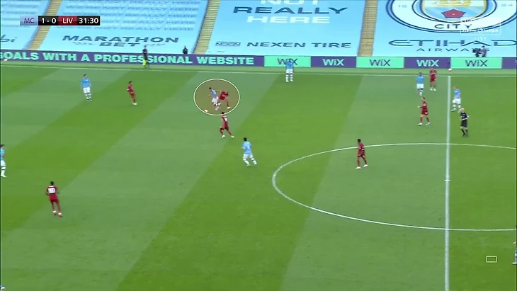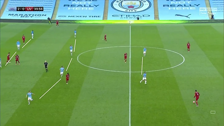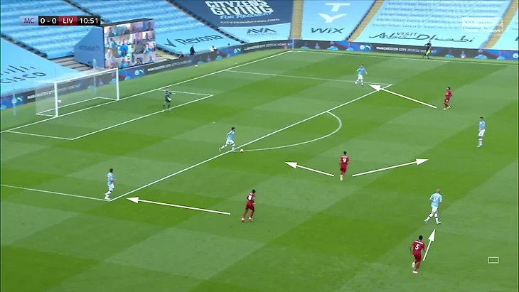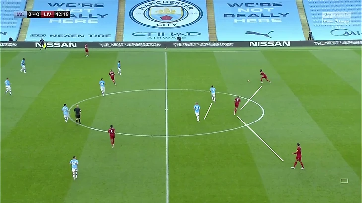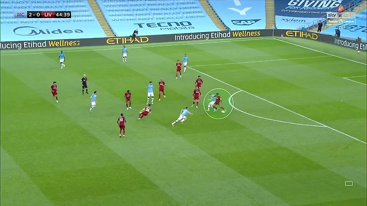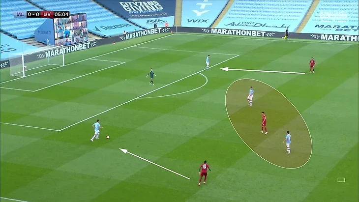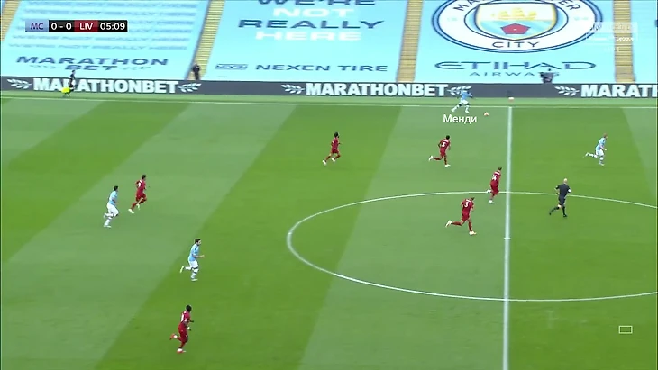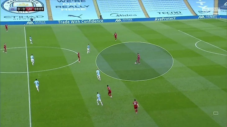 Когда «Ливерпуль» включал прессинг с упором на центр, «Сити» искал фланговых защитников, которые получали несколько дополнительных мгновений свободы и возвращали мяч в центр (в опорную «Ливерпуля»).