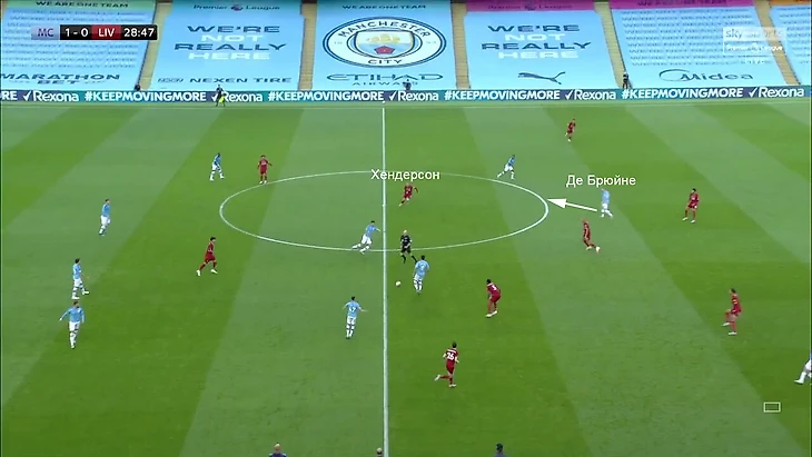 Десятка – это главная позиция Кевина в матче. Оказываясь между защитой и полузащитой соперника, он умно открывался и созидал. Здесь КДБ смещается в слегка открывшуюся зону, как только Хендерсон выдернулся в прессинг (также пользуется тем, что Фабиньо его не видит). Из-за такого расположения Де Брюйне ему проще доставить мяч, а при получении у него будет пара секунд свободы: