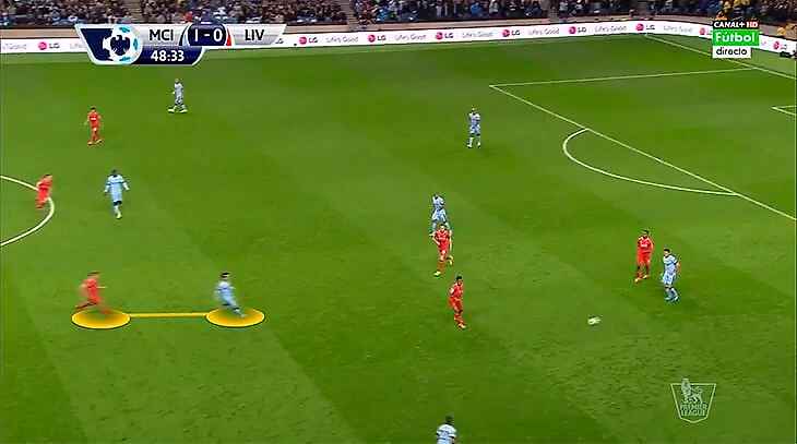Потом замечает, что Джеррард засмотрелся на мяч и больше не контролирует зону, которую оставил ради погони за ним. Сильва врывается в нее.