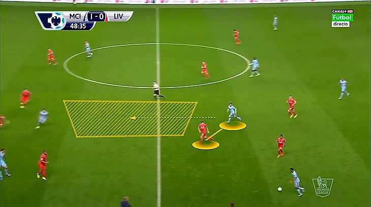 Чтобы получить пространство без помощи партнеров, Сильва манипулировал позицией соперника. Вот пример из матча с «Ливерпулем» в сезоне-2014/15. Сначала Сильва опускается на свою половину и вытягивает за собой Стивена Джеррарда.