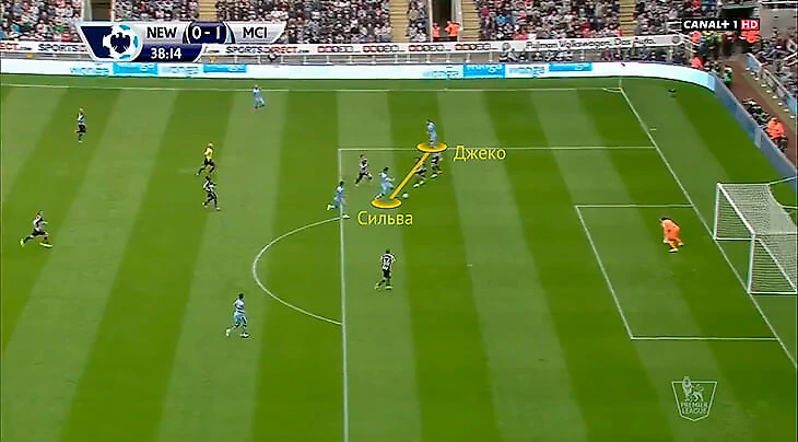 Матч с «Ньюкаслом» в сезоне-2013/14. Джеко сместился ближе к левому флангу, Сильва врывается в штрафную под передачу.