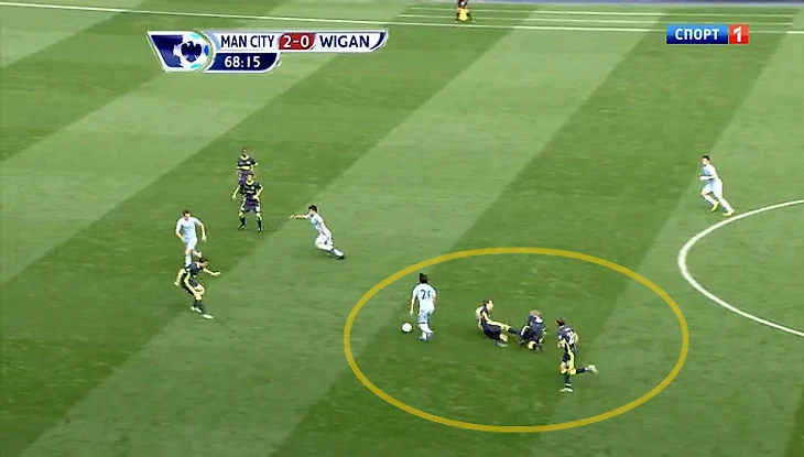 Мой любимый эпизод в этом плане – из домашней игры с «Уиганом» в сезоне-2011/12. Тут Сильва получает мяч в окружении трех соперников. Задачу осложняет еще и отсутствие партнеров для передачи.