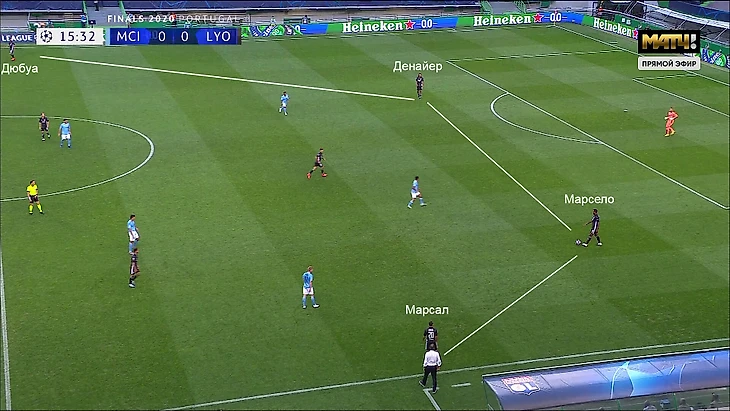 7. Еще один плюс схемы «Лиона» – она может трансформироваться и при позиционных атаках. Часто Марсал становился левым защитником, а центре остались только Марсело и Денайер: