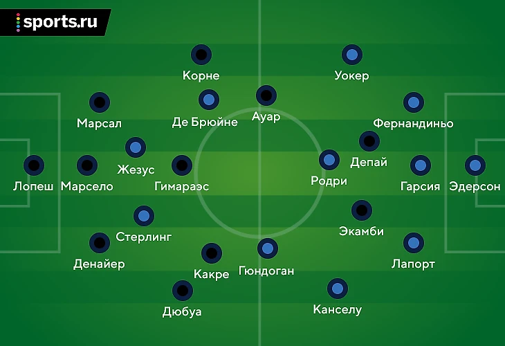 Эдерсон, Лапорт, Эрик Гарсия, Фернандиньо, де Брюйне, Стерлинг, Жоау Канселу, Гюндоган, Родри Эрнандес, Уокер, Габриэл Жезус