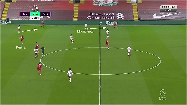 Дальше все рушится по цепочке. Мэйтленд вынужден выдвигаться. Тирни идет за Салахом на фланг и не контролирует зону, в которой теперь Наби Кейта: