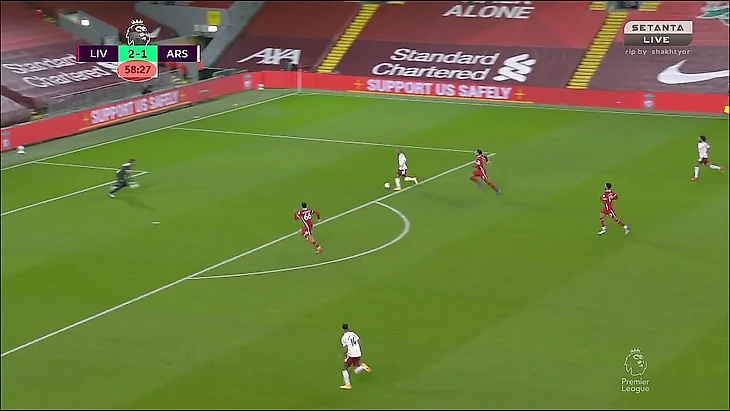 Это помогло «Ливерпулю» и в голах. Разберем на примере первого. Ван Дейк замечает выдвижение Обаяменга и переводит на Трента: