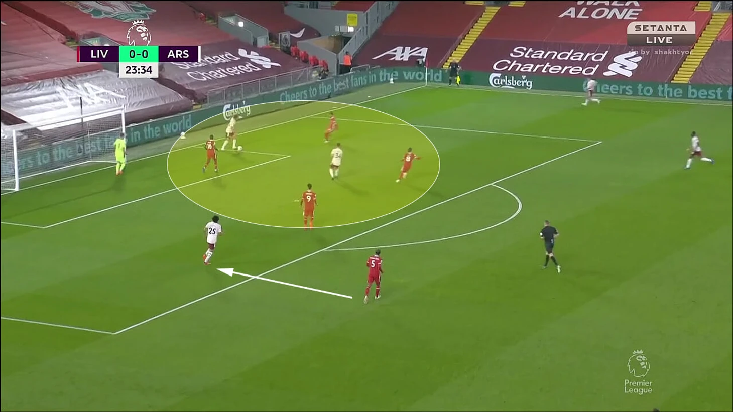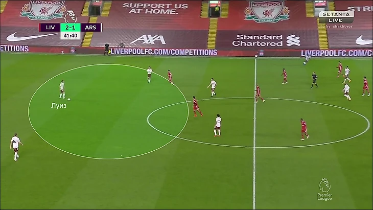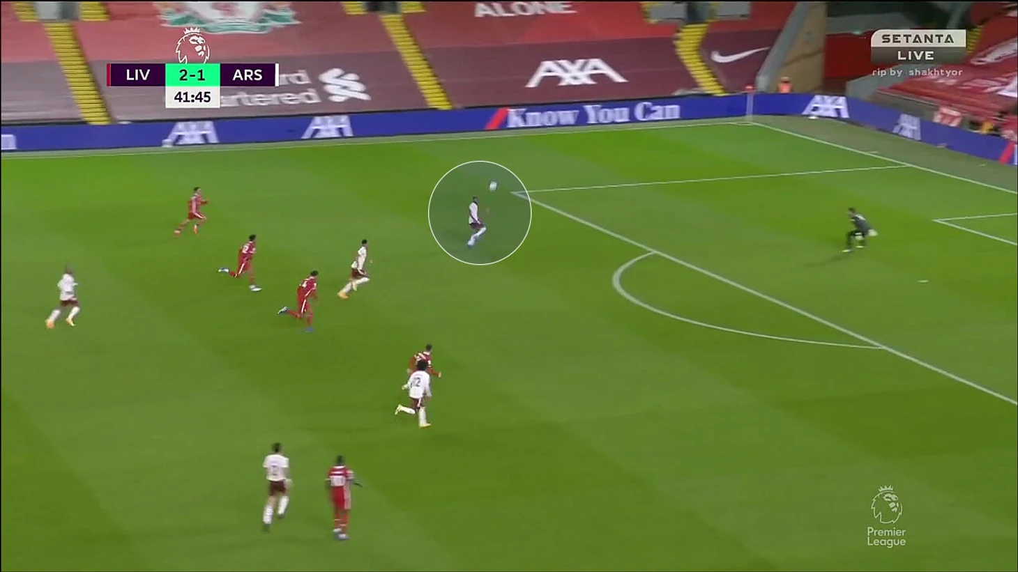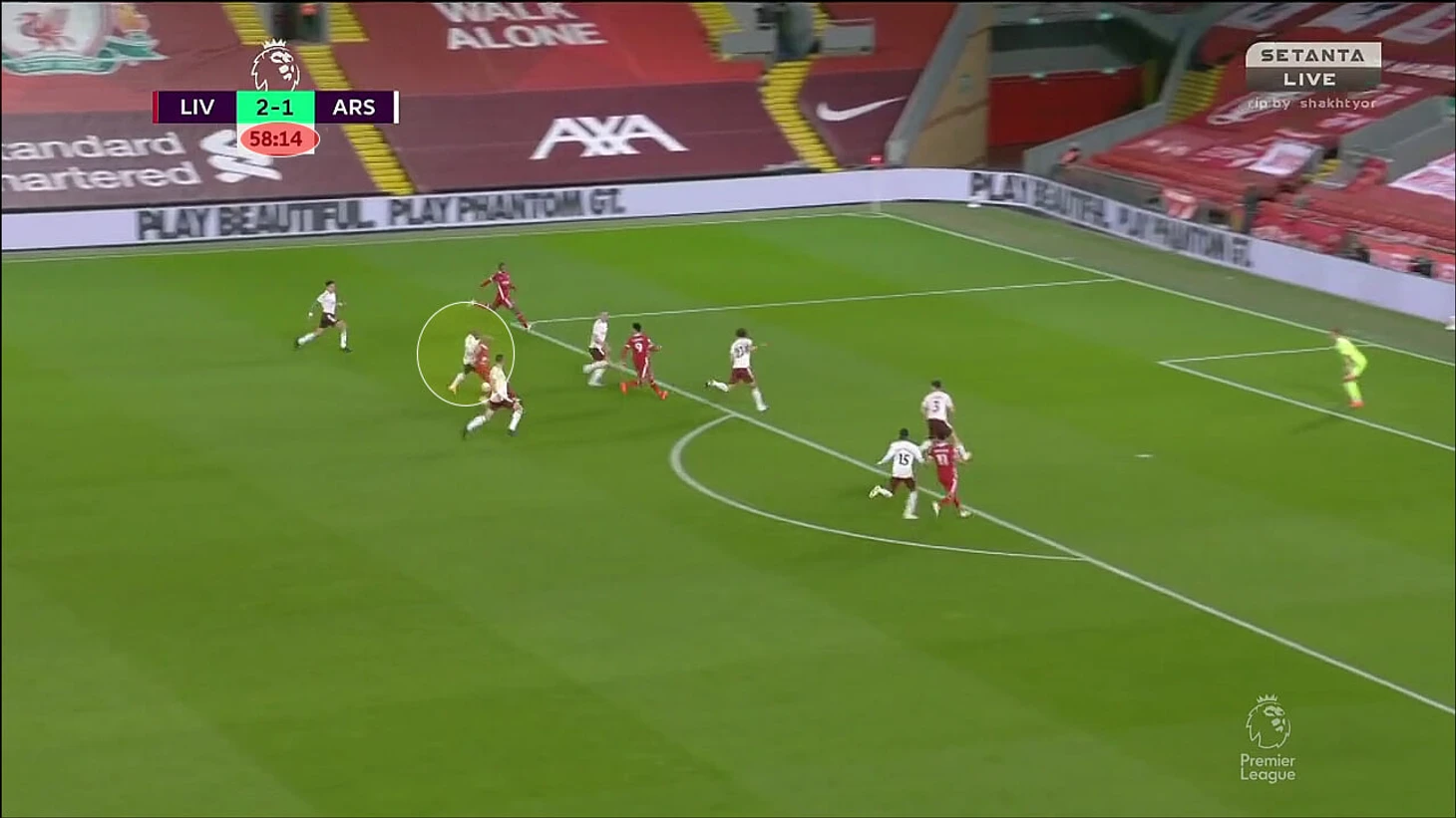 Здесь были минимальные ошибки в прессинге со стороны Кейта (ниже разберем), но в большинстве эпизодов такого давления хватило бы для отбора на чужой половине поля. Прессинг «Ливерпуля» не рассыпался сам – чтобы его пройти нужны были выдающиеся индивидуальные действия. В конкретном эпизоде у «Арсенала» все получилось – особенно важным и классным был пас Гранита Джаки.