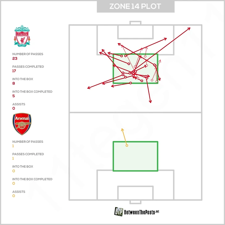 Слова тренера «Ливерпуля» отлично дополняются этой схемой. Здесь передачи из опорной зоны соперника. «Ливерпуль» проникает туда, но не очень охотно обостряет. «Арсенал» – 1 пас (и тот назад – настолько мощным был контроль «Ливерпуля»):