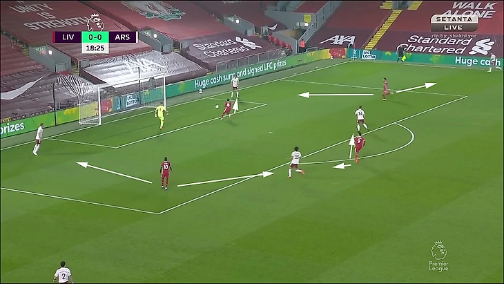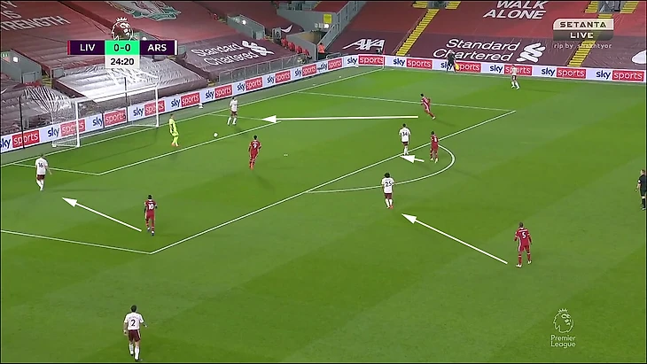 Во-первых, такой объем давления не мог вообще не дать моментов из затяжных позиционных атак (кое-что «Ливерпуль» придумал). Во-вторых, у команды достаточно альтернативных методов вскрытия соперника (стандарты; прессинг и контрпрессинг; вертикальные атаки в случае, если «Арсенал» теряет мяч или решает прессинговать). Подробнее разберем эти методы ниже.