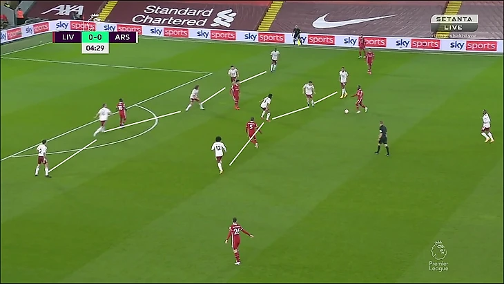 6. Качество прессинга «Ливерпуля» было ключевым отличием от матча за Суперкубок, где план «Арсенала» сработал более эффективно. По традиции при розыгрышах «Арсенал» переходил на четверку защитников (Тирни уходил на левый фланг). «Ливерпуль» максимально интенсивно прессинговал центральную зону – здесь перекрывались все варианты, Мане и Салах давили на центральных защитников, партнеры читали развитие атаки: