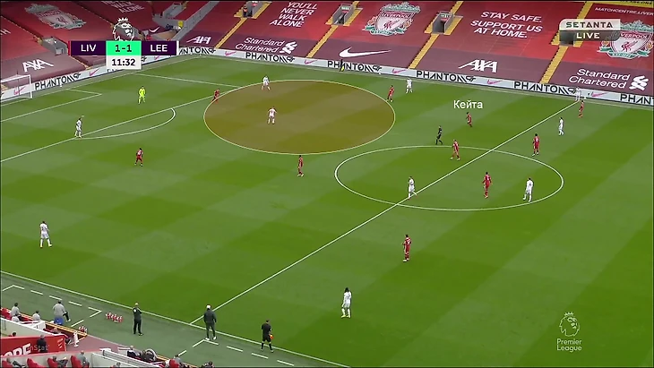 Вот пример из матча с «Лидсом». Кэлвин Филлипс получил пугающую свободу. Кейта с опозданием попытался его накрыть (опять же можно договориться с Салахом, но нет взаимопонимания – в аналогичных эпизодах после гола Филлипса накрывал именно Кейта):
