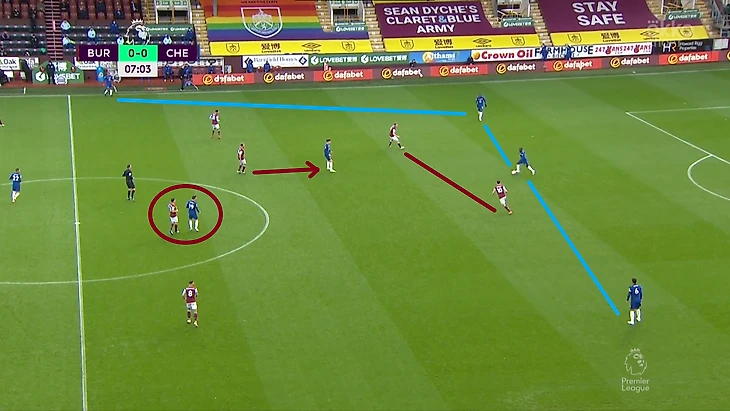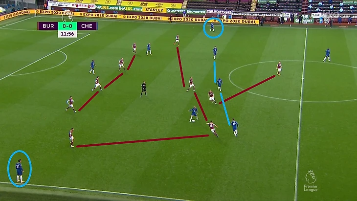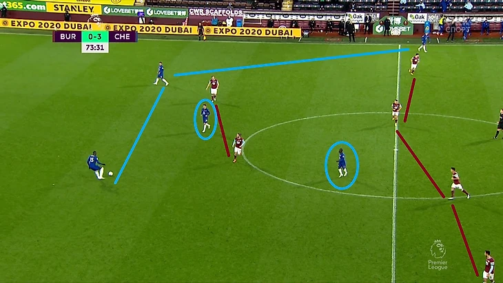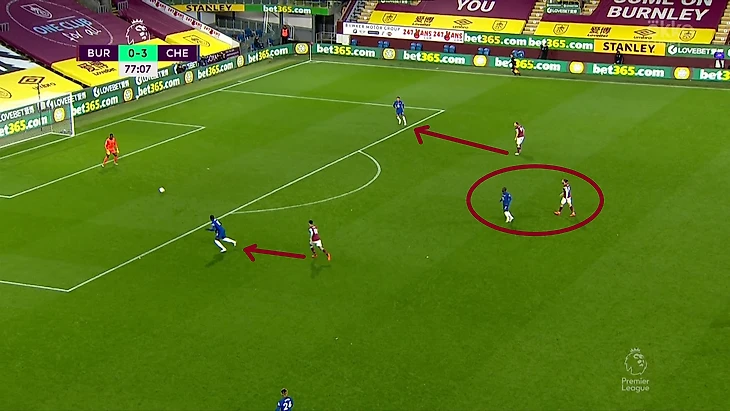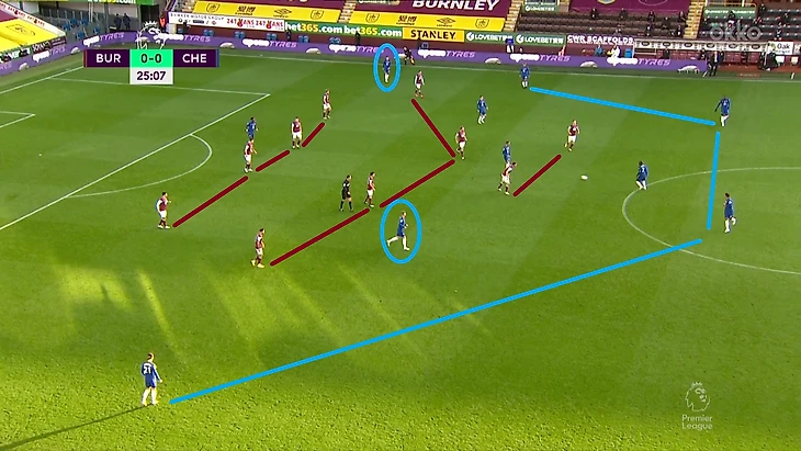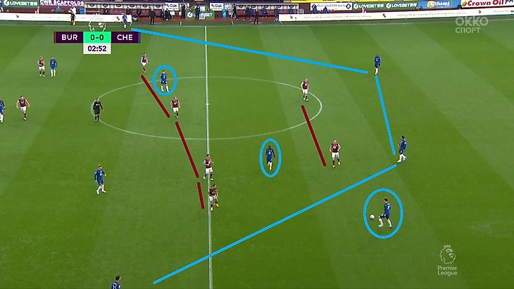 Когда структура «Бернли» была 4-4-2, тройка центральных полузащитников «Челси» была закрыта не только средней четверкой, но и поджимавшими их по ситуации игроками защитной линии. Абрахам и Зиеш оставались между соперниками, чтобы получить шанс на рывок или открыться под прием. При создании перегруза и для успешного хождения мяча важную роль играл Тимо Вернер.
