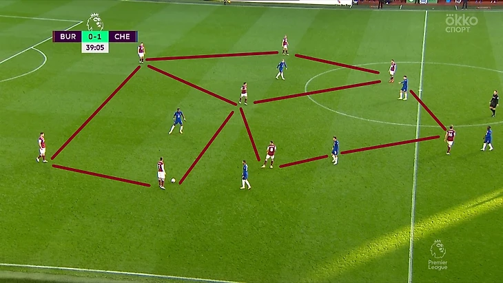 Но когда была возможность, «Бернли» пытались использовать похожие принципы поиска пространства и времени. Очевидно, что подбор игроков в команде другой – нет массы техничных и позиционно-приученных футболистов, им требовалось растянуть свою атакующую структуру так, чтобы получать возможность играть как минимум в 2-3 касания, дабы не совершить обрез в опасной ситуации, когда срабатывал триггер прессинга «Челси».