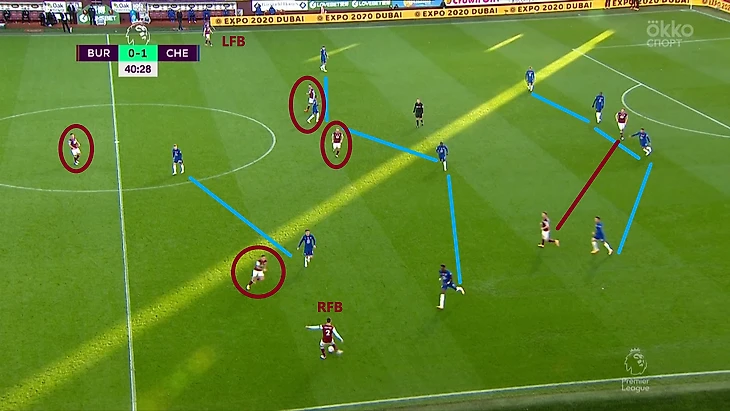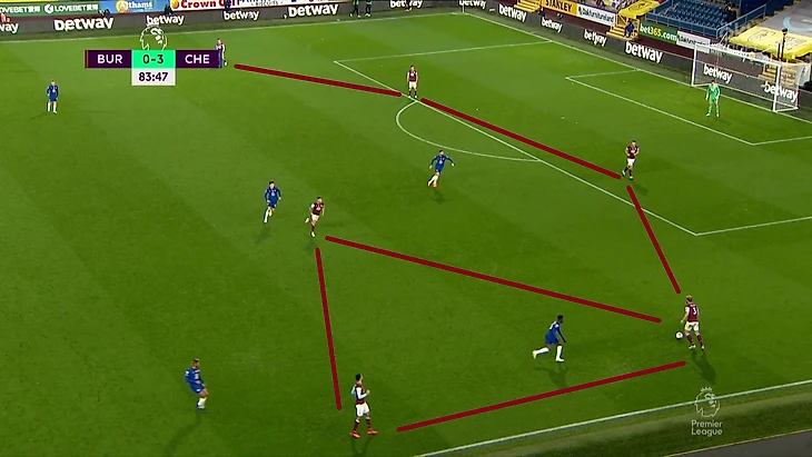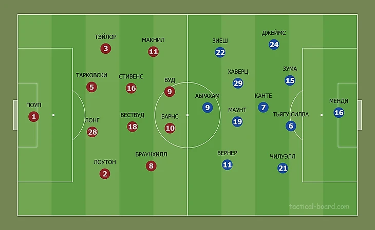 Также видоизменилась структура высокого прессинга хозяев. Два игрока закрывали двух центральных защитников, а третий подключавшийся накрывал опорника Канте. Крайние защитники «Бернли» поджимали передачи во фланг. Менди приходилось выбирать опцию дальнего паса.
