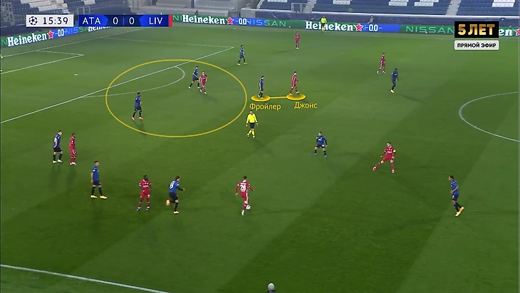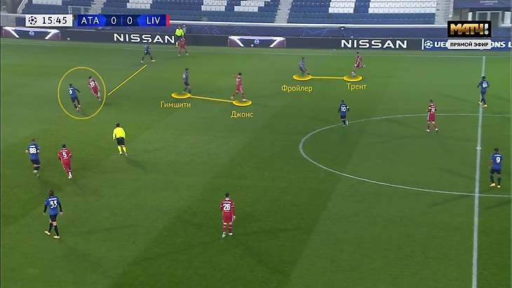 Мяч на левом фланге у Робертсона. Фройлер держит позицию и играет по Джонсу. Движение Жоты контролируют два защитника «Аталанты» – Паломино и Гимшити: