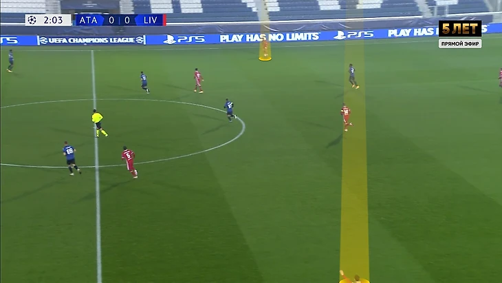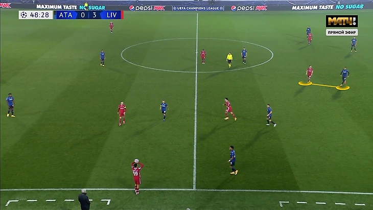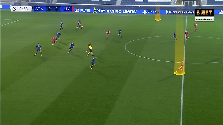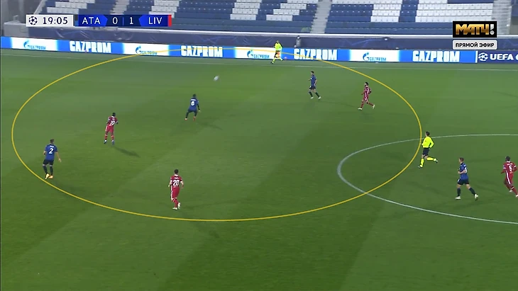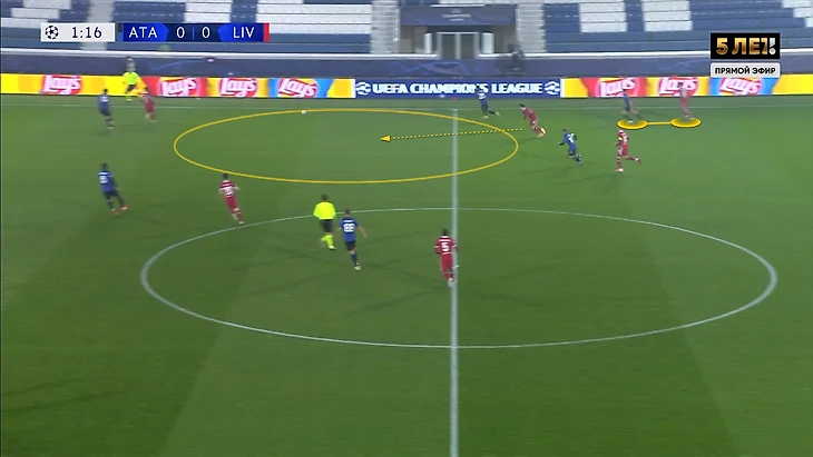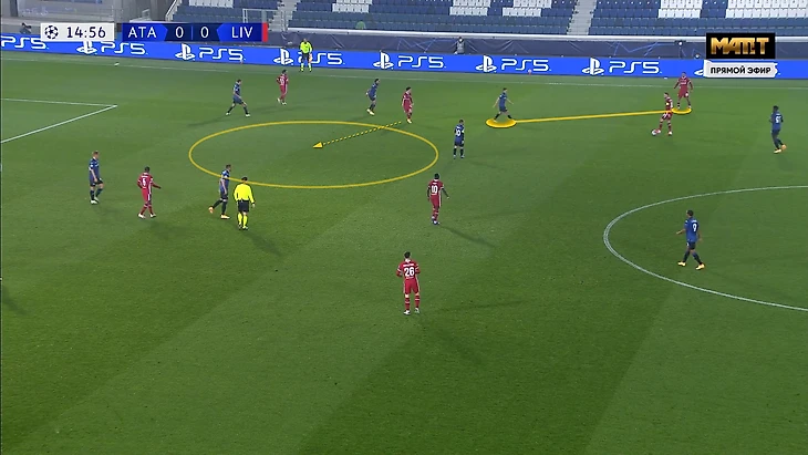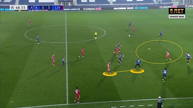 Следующая стадия – выдвижения в опорную зону защитников «Аталанты». Это происходило не всегда, но эпизодами было вынужденной мерой. Так можно закрыть свободное пространство для «Ливерпуля» в опорной. Иначе соперники получали не только мяч, но и время для прохода или паса.