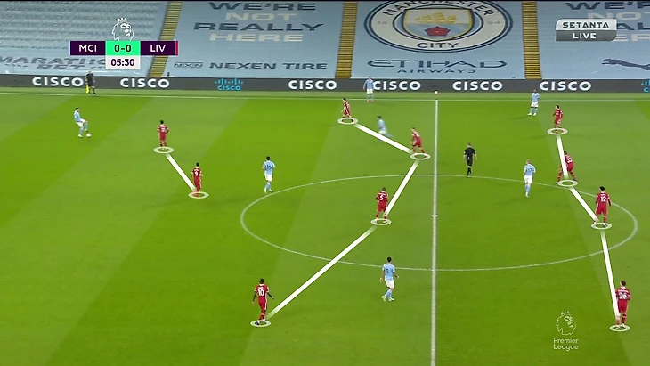 Идея была в том, чтобы создавать тройку в первой стадии. Это выливалось в ситуацию 3-в-2 против пары Фирмино-Салах. «Сити» не решил все проблемы, но получил чуть больше контроля над розыгрышами.