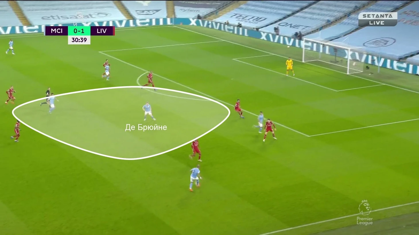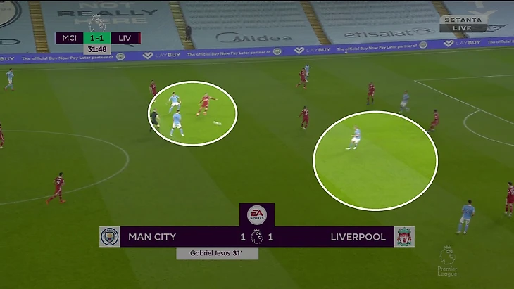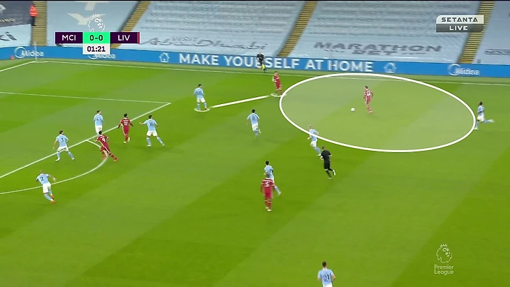 Де Брюйне идеальный игрок для таких эпизодов. Всегда ищет пространство в полуфлангах, дополнительно улучшает позицию за счет постоянной оценки ситуации, способен наказывать, получая свободу. Даже при плохих действиях опорников «Ливерпуля» зона открывалась лишь на 2-3 секунды, но бельгийцу этого достаточно.