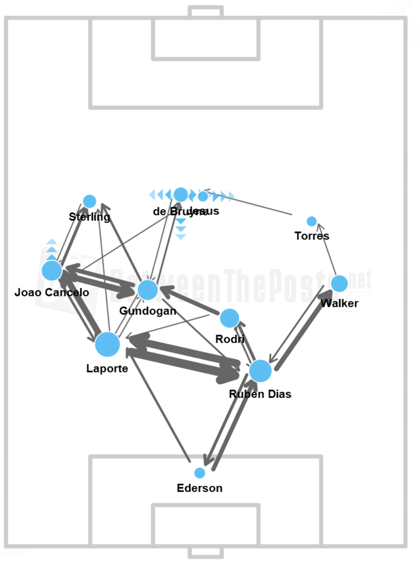 Ключевое отличие было в том, что при ситуации 3-в-2 в первой линии есть явно свободный игрок. Через пару передач «Сити» находил его, а дальше можно искать варианты – продвижение с мячом или рискованный пас в чужую опорную.