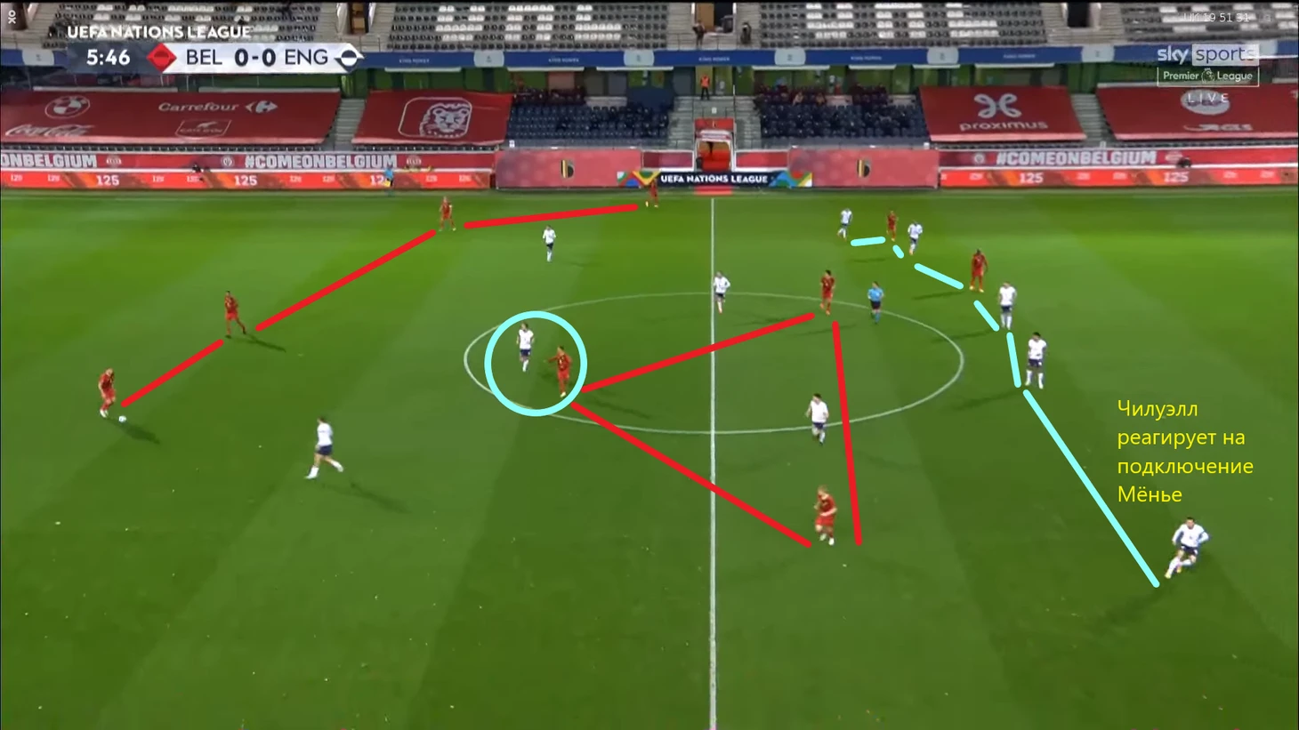 Нельзя не отметить, что 5 игроков Бельгии по ширине поля создавали массу трудностей для гостей – помимо закрытого из-за данной расстановки центра поля, приходилось опускать туда-сюда кого-то из игроков для создания ситуаций 5 в 5 по ширине. Вот один из эпизодов, когда Англия атакует в схеме 3-2-5, Бельгия находится в своей 5-3-2, Прат реагирует на Уокера, получающего мяч.