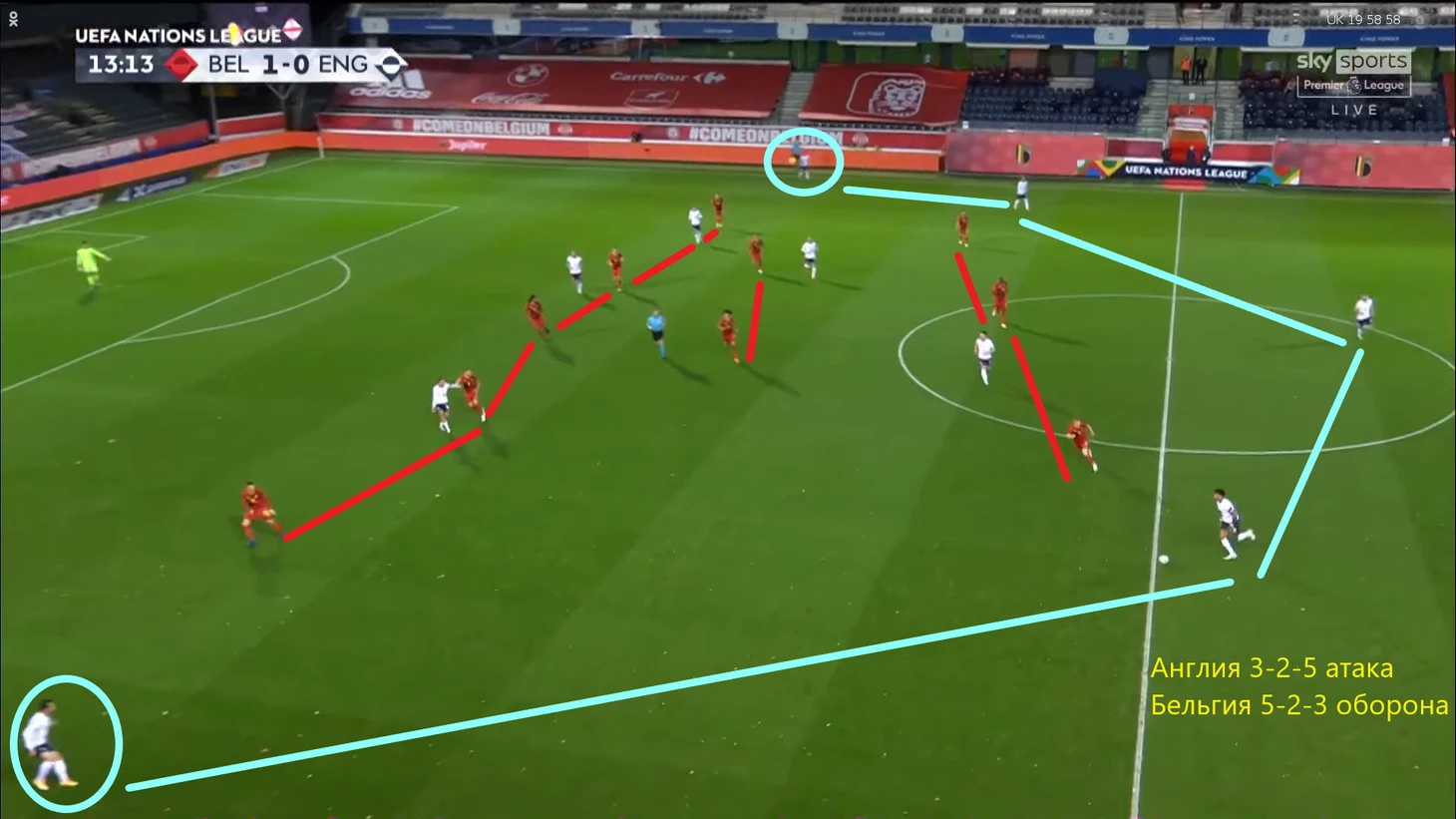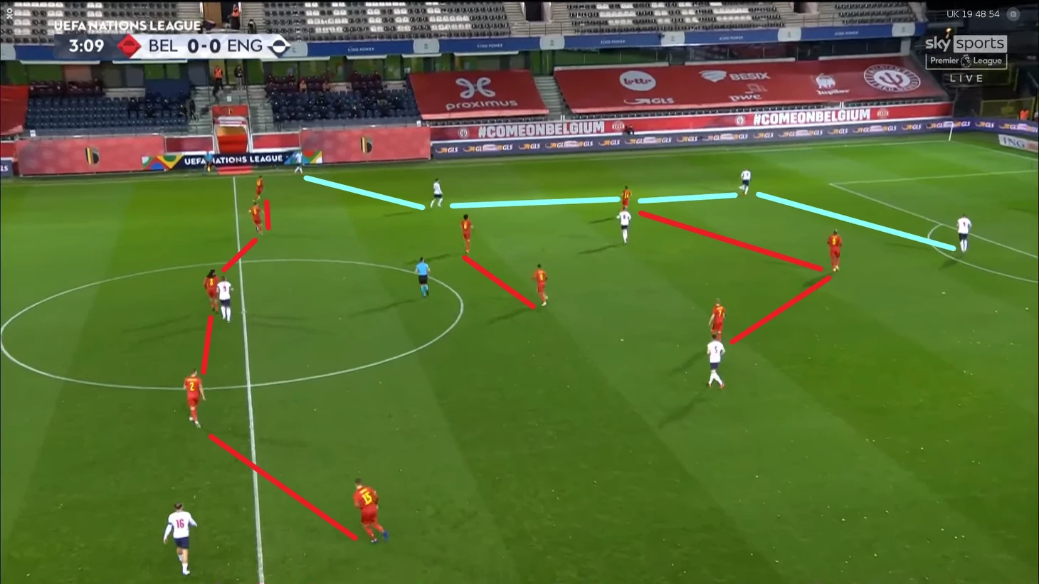 Билд ап сборной Англии начинался по схеме 4-2-4, дальнейшее перестроение на 3-2-5 зависело от выбранного вектора развития атаки. Бельгия выжидала в оборонительном корсете 5-3-2, создавая перегруз 3 в 2 в центре и 5 в 4 в защитной линии, отдав свободу Уокеру и Сака в начальной стадии этой фазы игры.