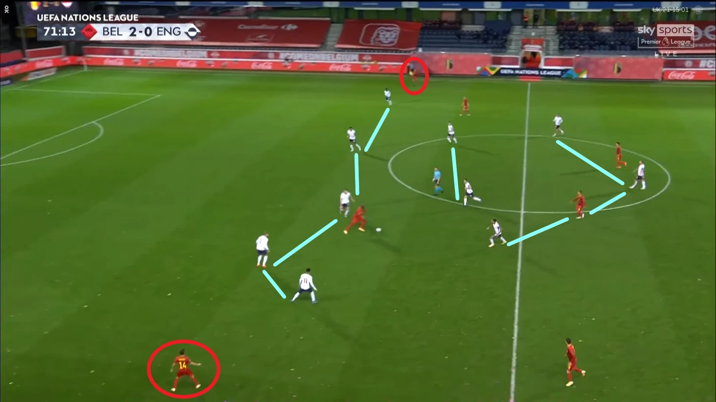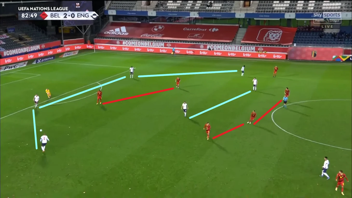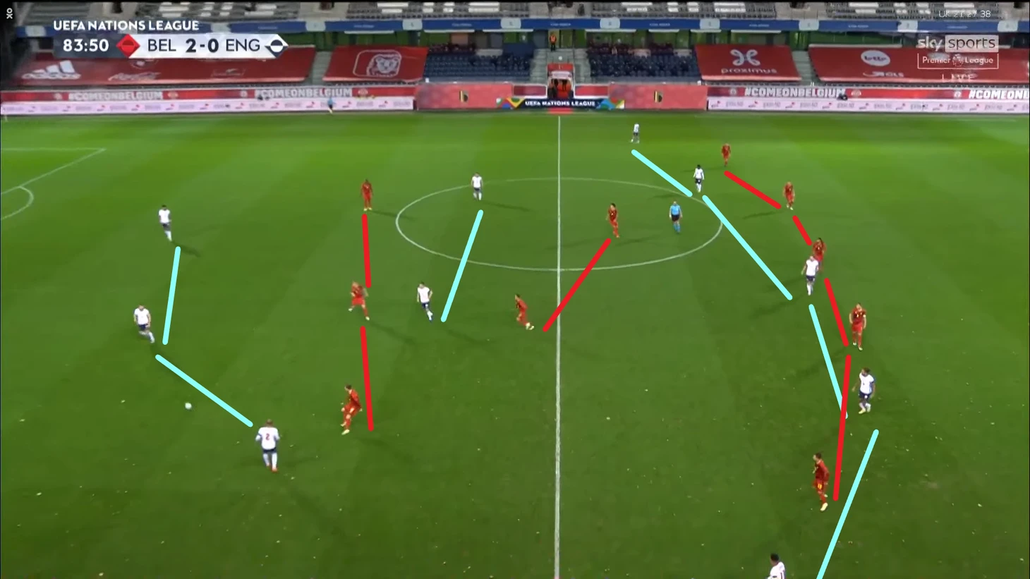 Даже при розыгрышах от ворот, Мартинес опускал Кевина Де Брюйне ниже, для создания перегруза в центре. Зацикленность Англии на высоком расположении атакующей тройки позволяла хозяевам господствовать в центре: