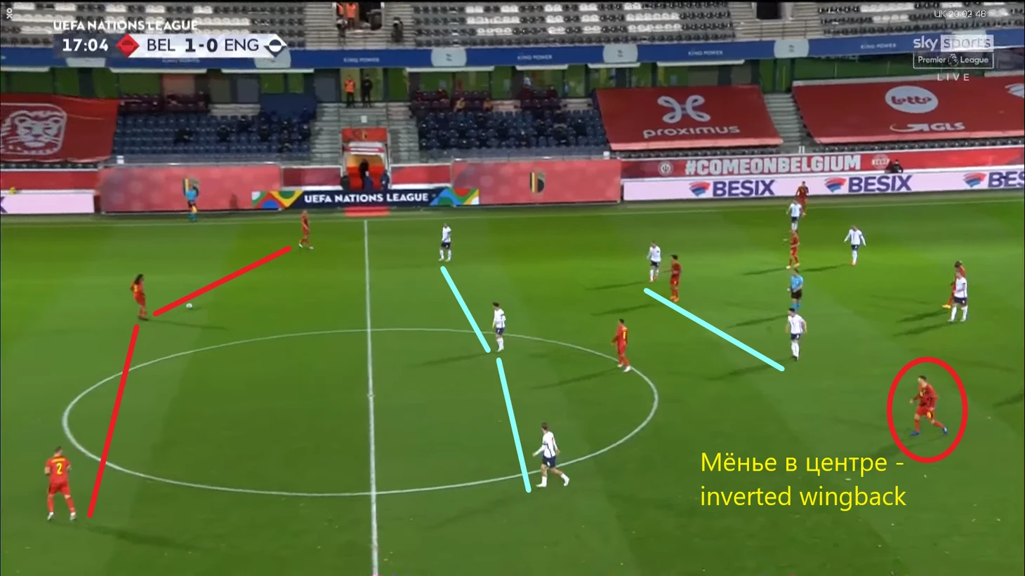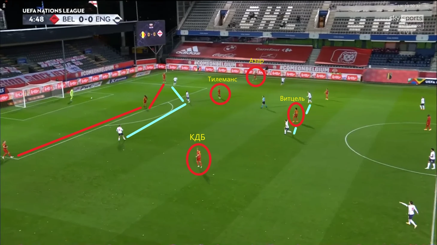 Когда мячом владела сборная Бельгии, тройка ЦЗ была первым звеном атакующей фазы. Тилеманс и Витцель опускали ближе к ним, чтобы продвигать мяч вперед или развивать атаку через фланг. Помимо поиска острых, но не рисковых решений, проблемой были прессинг-ловушки гостей. Харри Кейн чаще всего закрывал Тилеманса, находившиеся по бокам Маунт и Грилиш создавали плотность в центре, а также реагировали на передачи в сторону. Мартинесу требовалось вмешаться в наглое «отзеркаливание» его замысла, в связи с чем он предпринял следующие тактические финты: