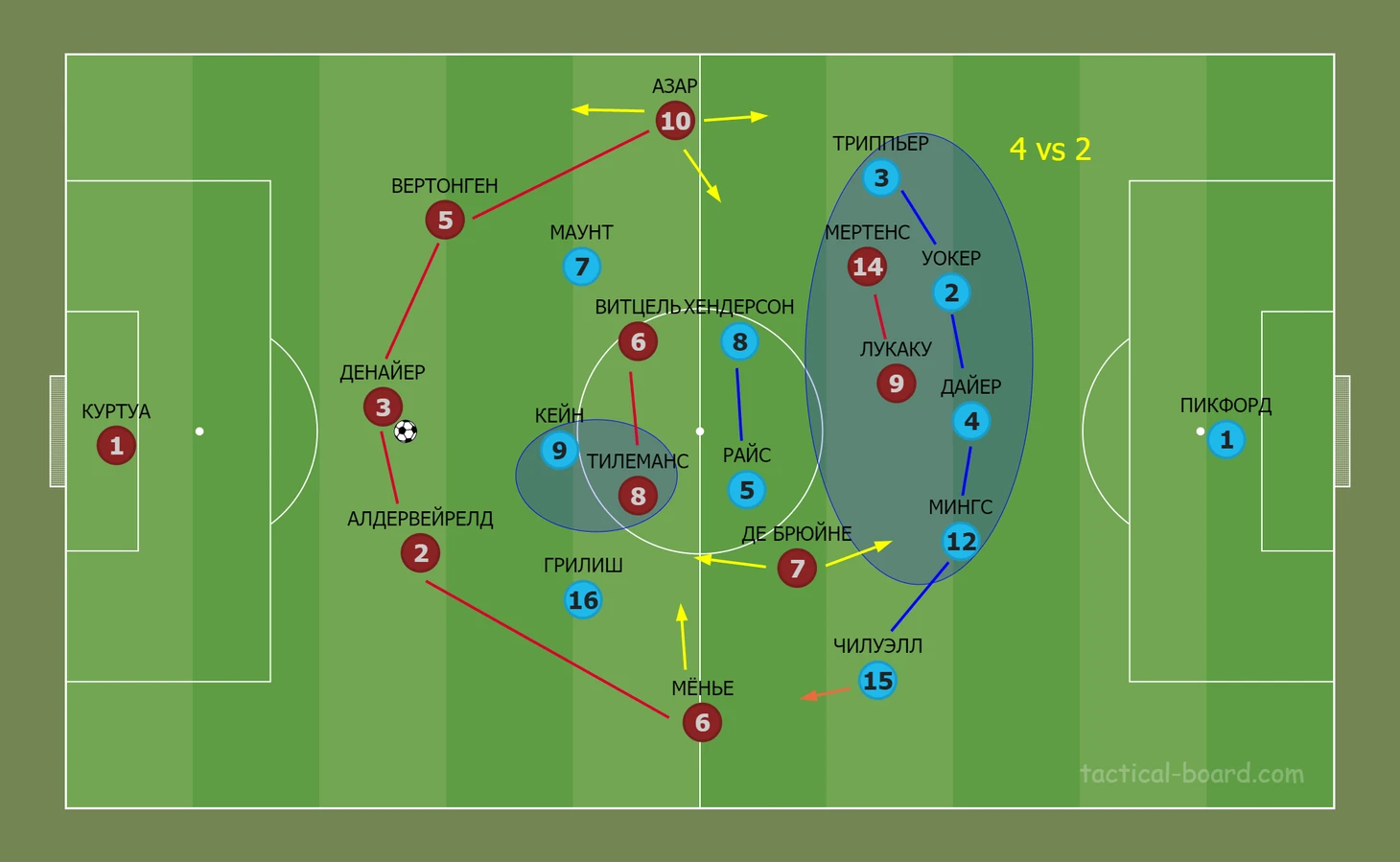 Мартинес пробовал и еще один вариант обострения игры. Когда гости выстраивались в свои оборонительные 5-2-3, Азар уходил широко во фланг, тройка атаки Де Брюйне, Лукаку, Мертенс держала пятерку защитников вместе (4 против 5). Англичане зеркалили тройку ЦЗ хозяев, формируя ситуацию 3 в 3. Тилеманс и Витцель попадали под опеку пары опорников Райс – Хендерсон. Иными словами, расстановка игроков была похожа на 3 в 3, 2 в 2 и далее 5 в 5. Именно в таких случаях Менье смещался в центр, чтобы создать 3 в 2 в центре поля. Четверо бельгийцев держали пятерку англичан – гости ни в коем случае не могли оставить ситуацию 4 в 4 по защитной линии.