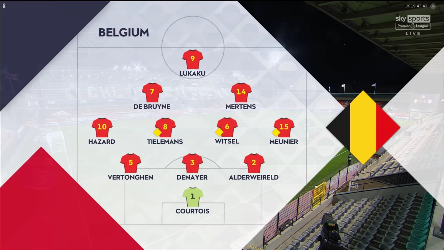 Роберто Мартинес выбрал знакомую всем 3-4-2-1. Тройку центральных защитников по бокам страховали правый защитник Тома Менье и вингер Торган Азар. Пару опорников составили Витцель и Тилеманс, тройка атаки – мощнейший Ромелу Лукаку, проворный Дрис Мертенс и умнейший Кевин Де Брюйне.
