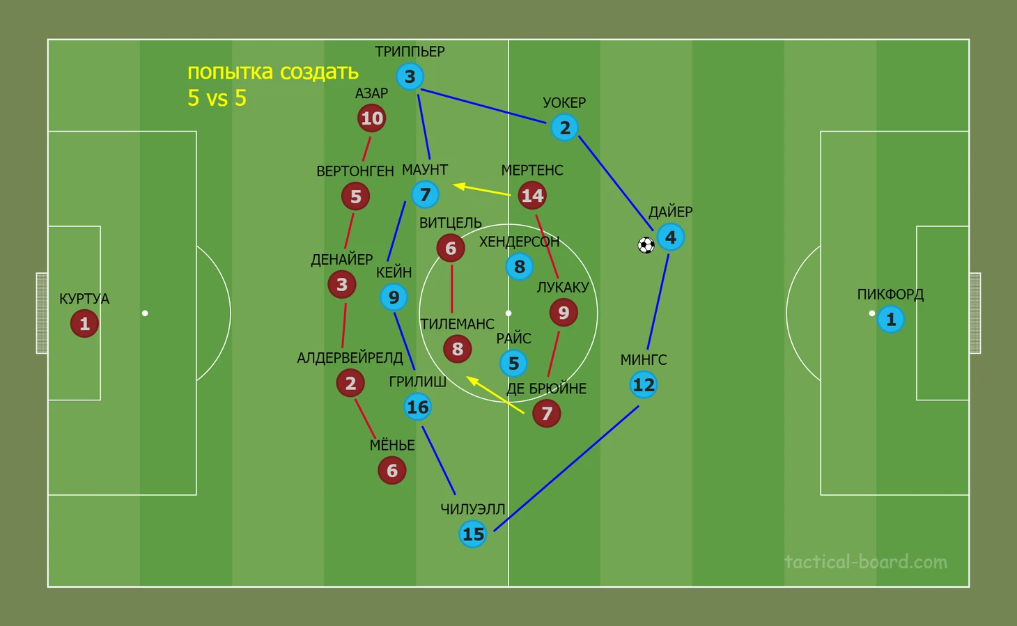 Посмотрим на те моменты, когда гости получали возможность достаточно спокойно строить свои атаки. Чилуэлл и Триппьер делали ширину, атакующая тройка держала пятерку защитников, Мертенс и Де Брюйне дежурили на случай рывков Грилиша и Маунта. Хендерсону и Райсу приходилось нелегко, ведь плотность в центре позволяла им разве что отдавать мяч во фланг, дабы не потерять его около пяти игроков соперника. Логически анализируя, как продвинуть мяч вперед, нетрудно догадаться, что крепкую закрывающую центр оборонительную схему Бельгии необходимо было растянуть и лишить баланса. Для этого было необходимо в первую очередь в буквальном смысле отлепить Азара и Менье от центральной тройки – создать ситуацию 3 в 3 по центру защитной линии для рывков за спину под разрезающие передачи вперед.