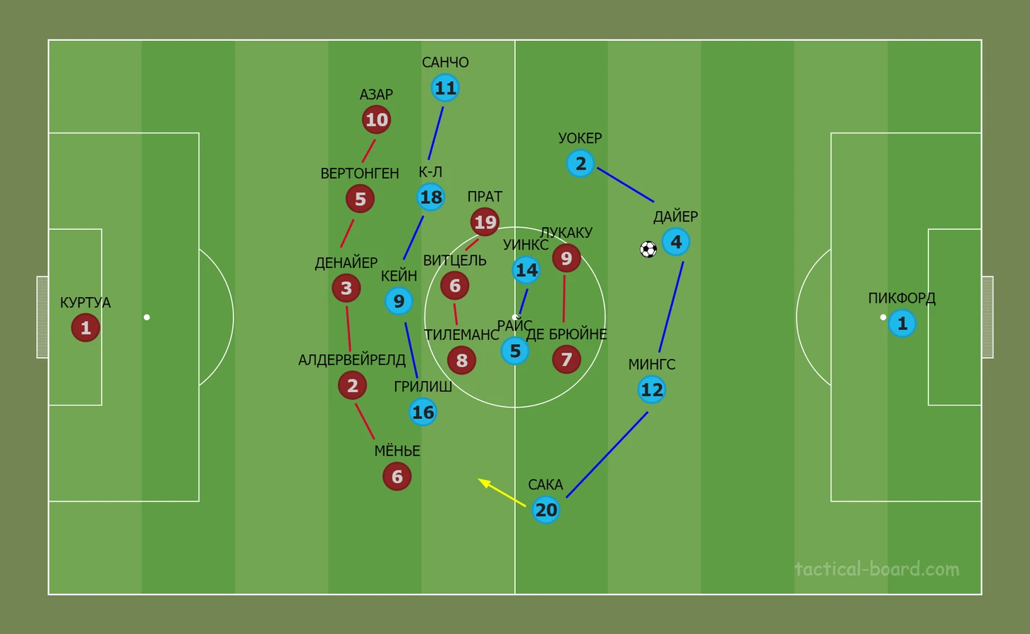 Таким образом, в оборонительной фазе игры Англия стала играть 4-4-2, в атакующей – 4-2-4. Грилиш, Санчо, Кейн и Кэлверт-Льюин держались как можно ближе к защитной пятерке бельгийцев. Мартинес решил образовавшиеся 2 в 2 в центре банальным переводом оборонительной схемы в 5-3-2, далее поменяв Мертенса на Денниса Прата, что сделало ситуацию в центре 3 в 2, причем бельгийцы стали иметь в этой зоне аж 3 опорных полузащитника. Лукаку и Де Брюйне должны были страховать эту тройку, а также искать шансы впереди, причем как шансы потянуть время и подержать мяч, так и сделать что-то острое голевое.