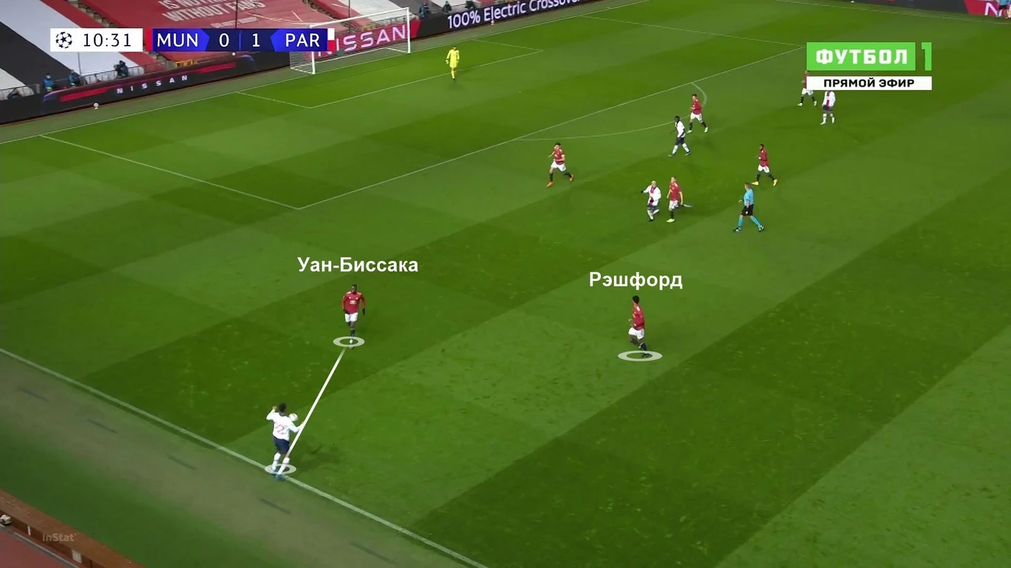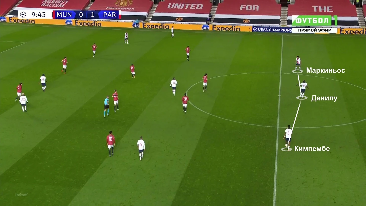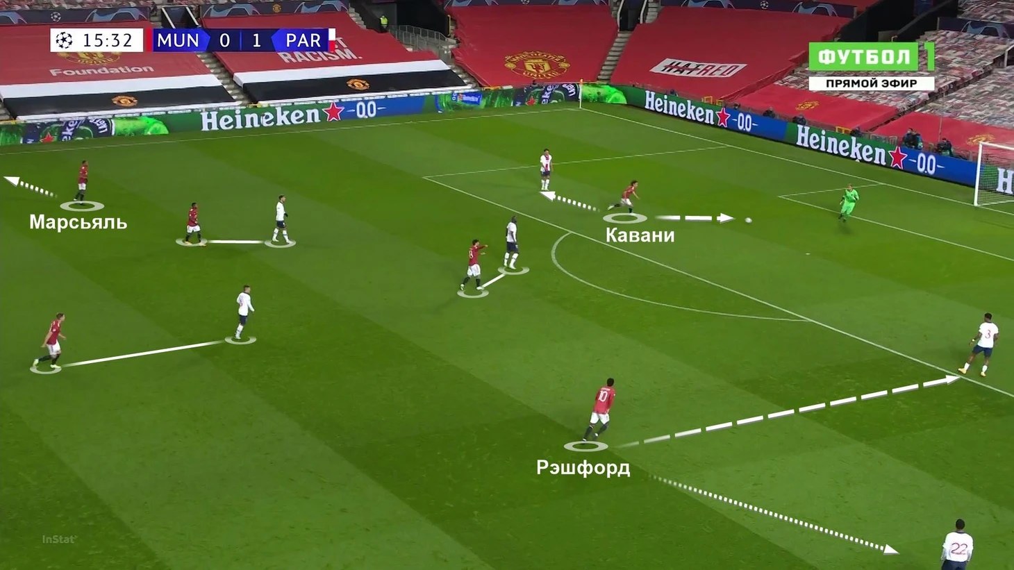 «Юнайтед» не прессинговал эпизоды, в которых «ПСЖ» успевал создать тройку через опускание Данилу. Но более раннюю стадию розыгрыша накрывал давлением. В центре поля играли персонально, Кавани давил на защитника и вратаря, а Рэшфорд и Марсьяль располагались между крайним защитником и центральным, готовы были в нужный момент поддержать Кавани: