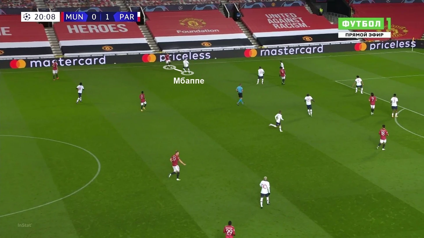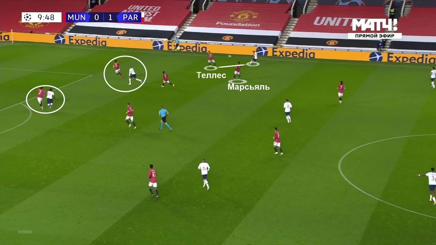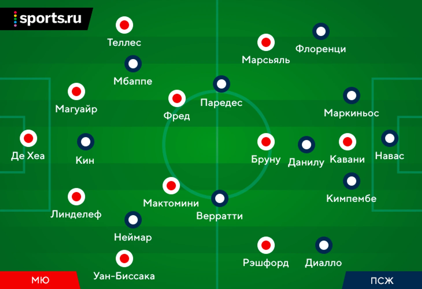 «Юнайтед» не прессинговал эпизоды, в которых «ПСЖ» успевал создать тройку через опускание Данилу. Но более раннюю стадию розыгрыша накрывал давлением. В центре поля играли персонально, Кавани давил на защитника и вратаря, а Рэшфорд и Марсьяль располагались между крайним защитником и центральным, готовы были в нужный момент поддержать Кавани:
