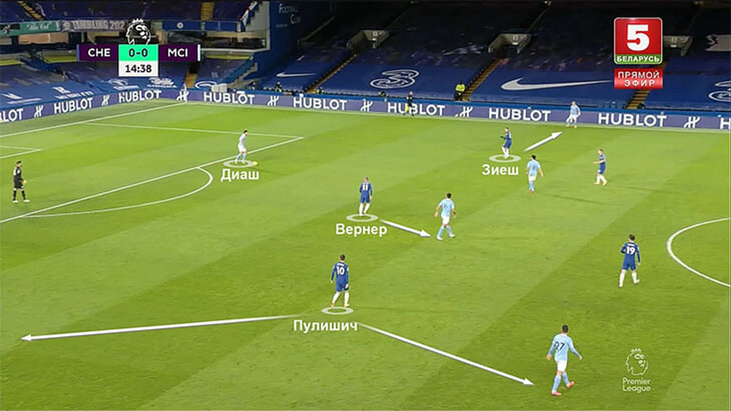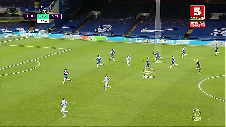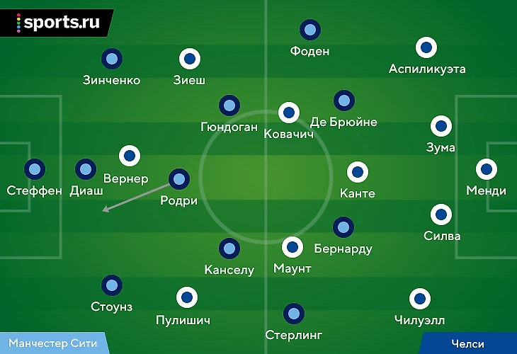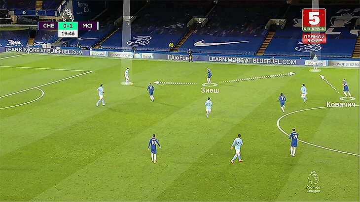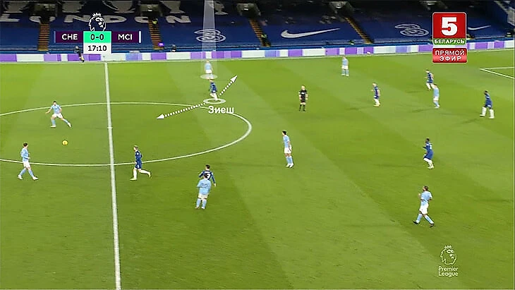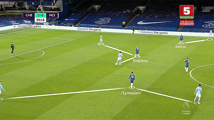 5. На практике частой была ситуация, когда только Зиеш играл четко по Зинченко, а два других атакующих игрока «Челси» путались. Вернер разрывался между Родри и Диашем. А Пулишич – между Канселу (его номинальный оппонент) и Стоунзом (становился правым защитником при розыгрышах).