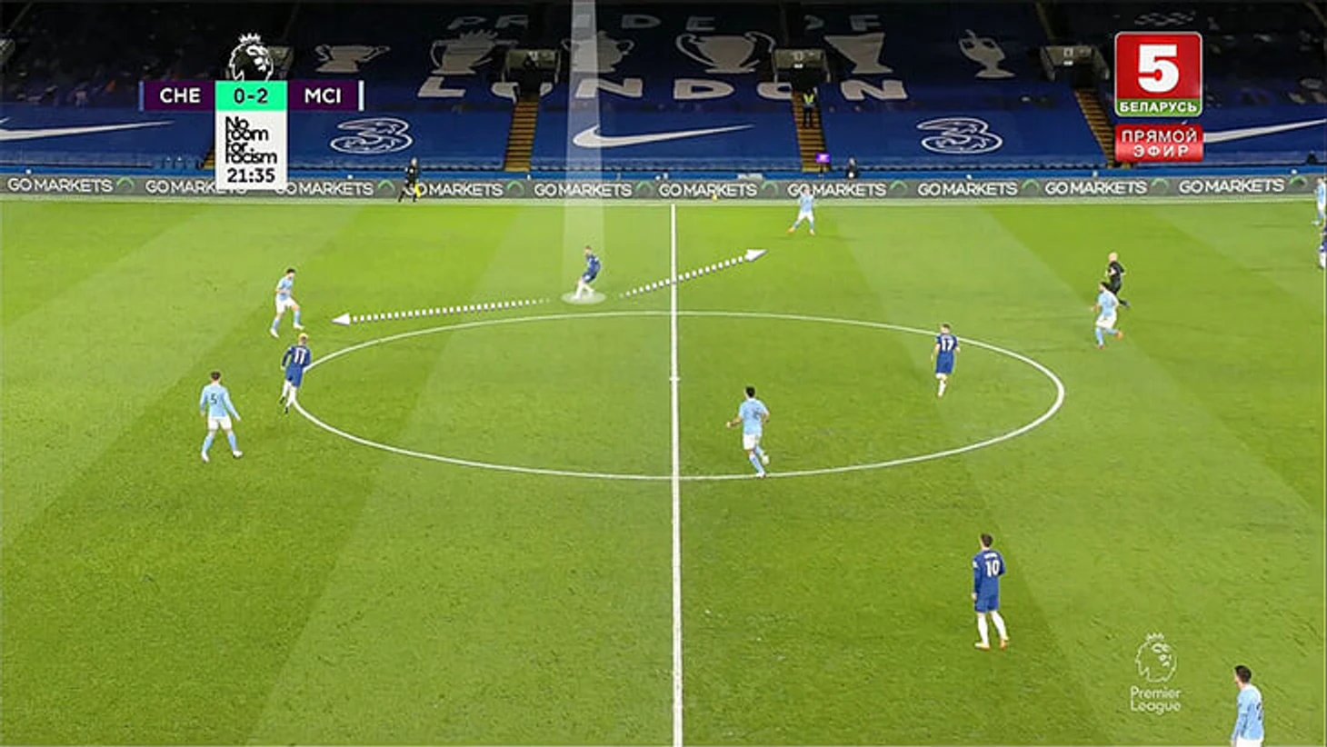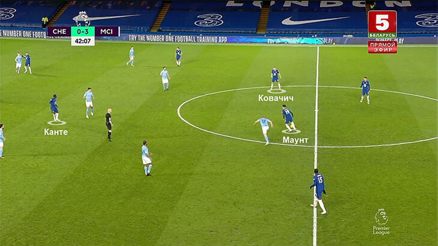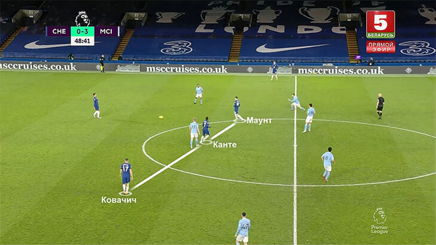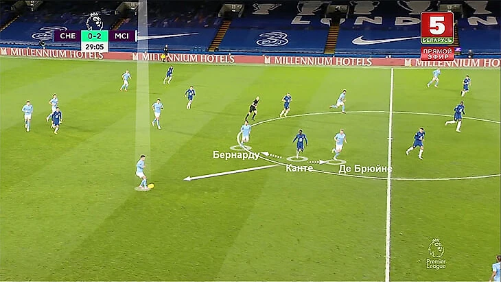 В этой ситуации Канте по сути один вынужден контролировать трех соперников (партнер по опорной Ковачич не особо спешит смещаться и помогать) – Бернарду, Канселу и Де Брюйне:
