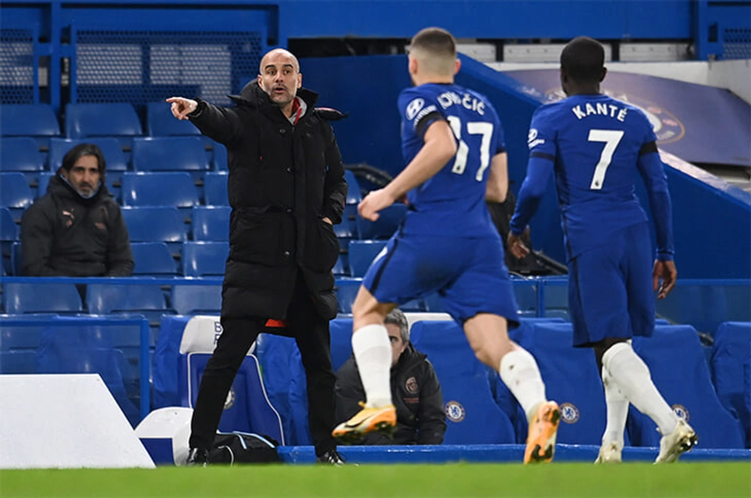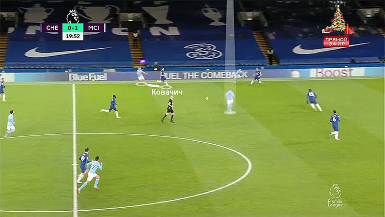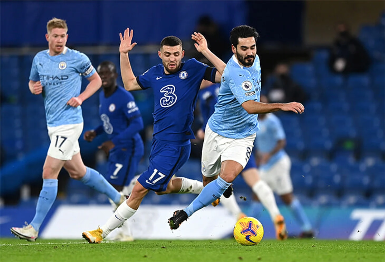 В этой ситуации Канте по сути один вынужден контролировать трех соперников (партнер по опорной Ковачич не особо спешит смещаться и помогать) – Бернарду, Канселу и Де Брюйне: