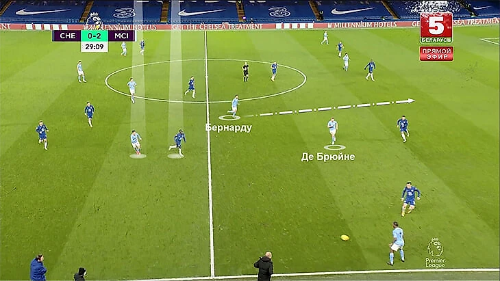 Результат: Канте не успеет накрыть Канселу, Де Брюйне свободным получит мяч в опорной, а атака завершится ударом Бернарду.