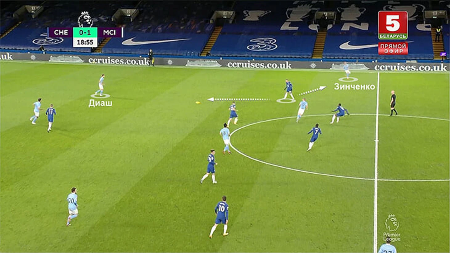 Зиеш не оказывает давления на Диаша, который продвигается с мячом, но снова не контролирует Зинченко: