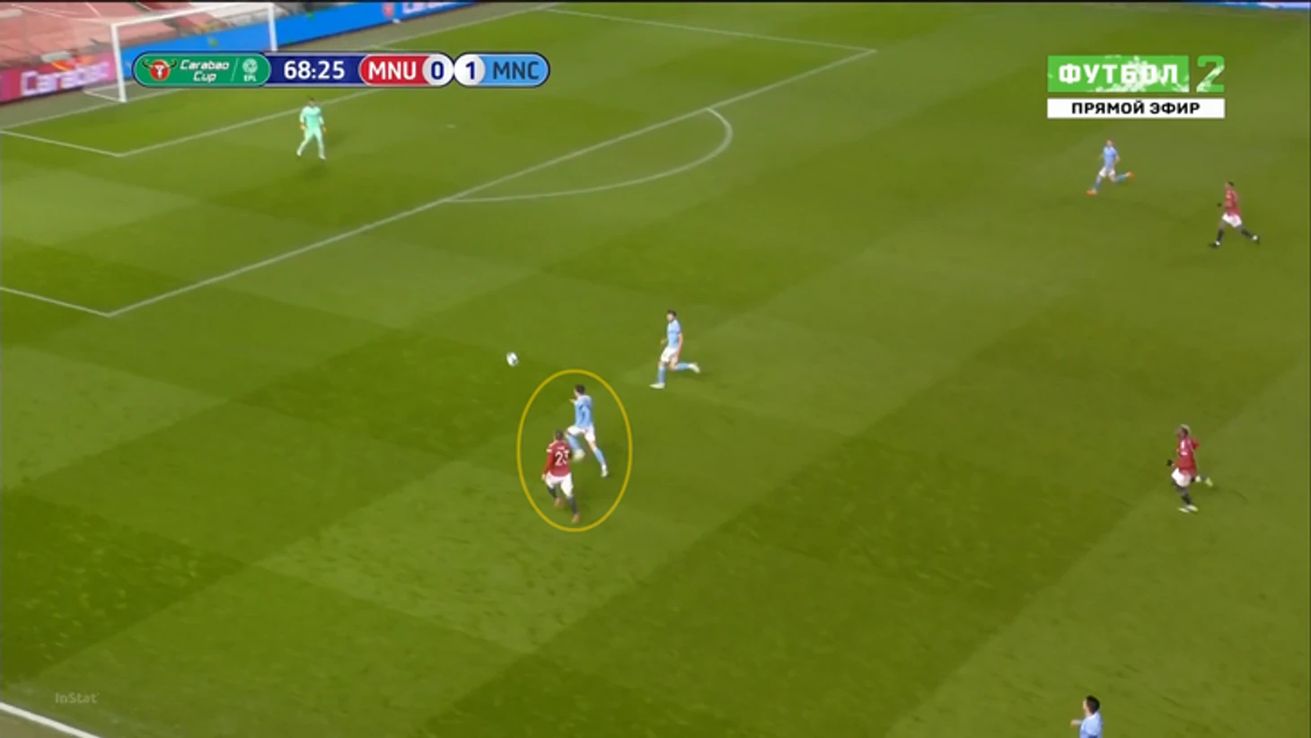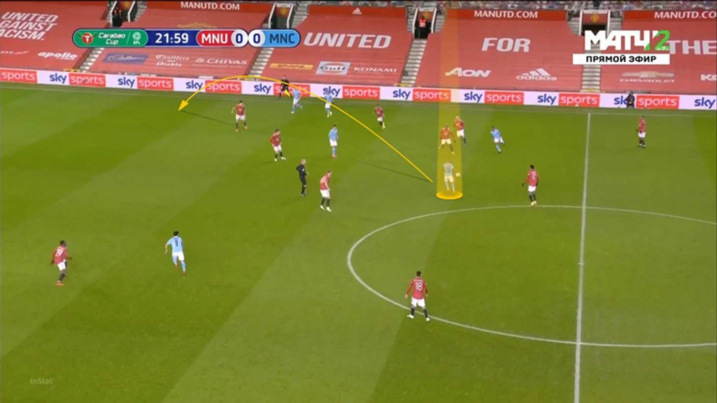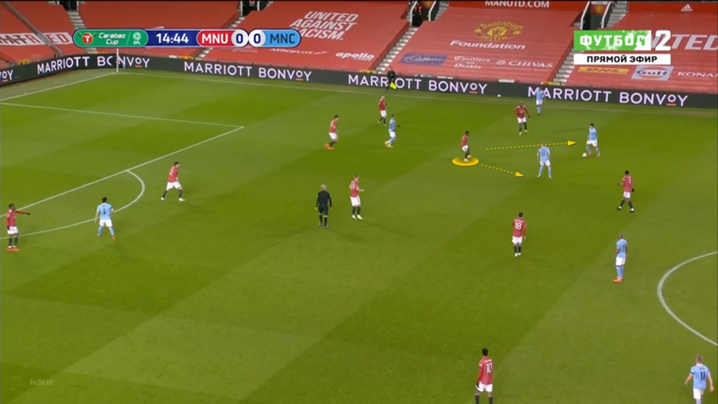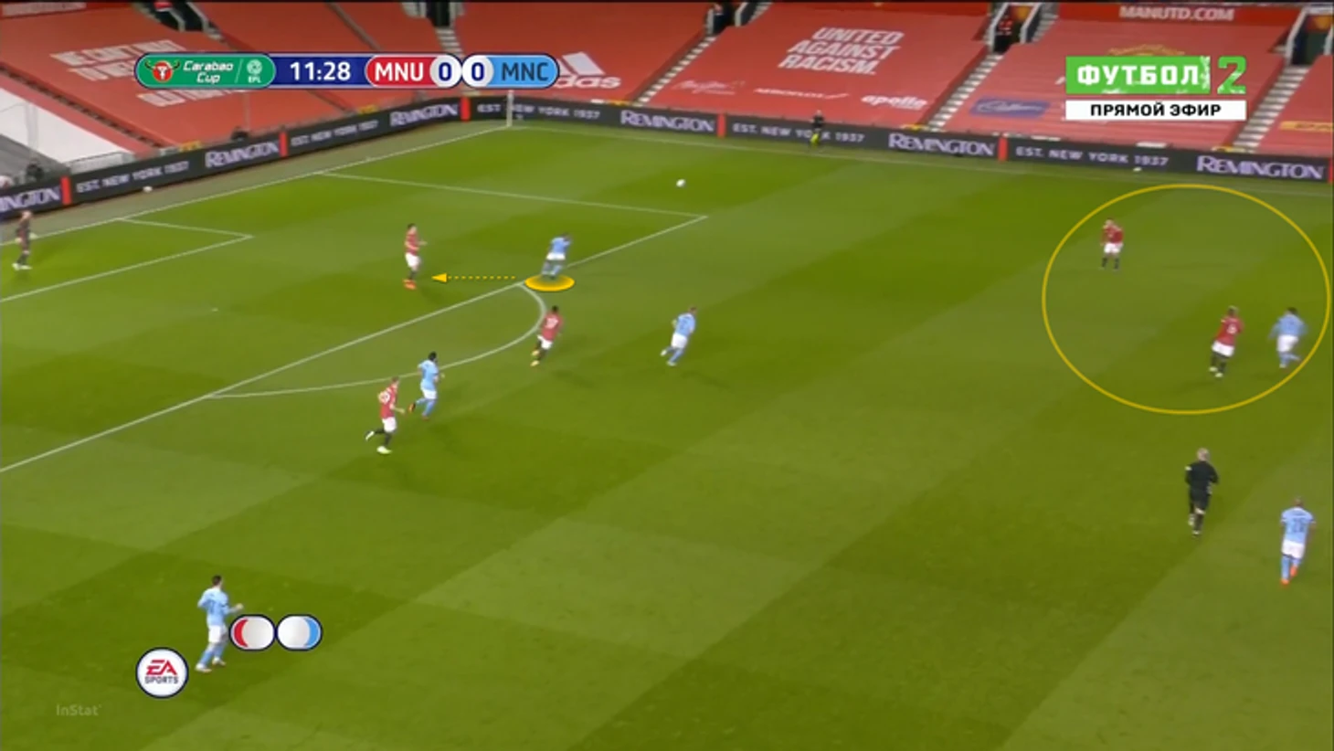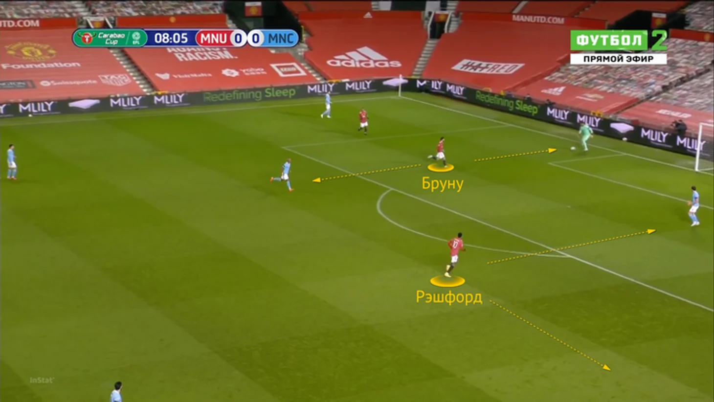 Ключевая идея «МЮ» – отрезать от эпизода минимум одного игрока «Сити» и сократить гостям зону для розыгрыша. С помощью Бруну это получалось особенно успешно.