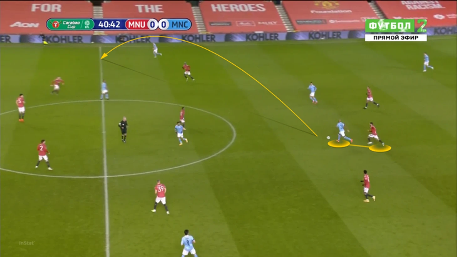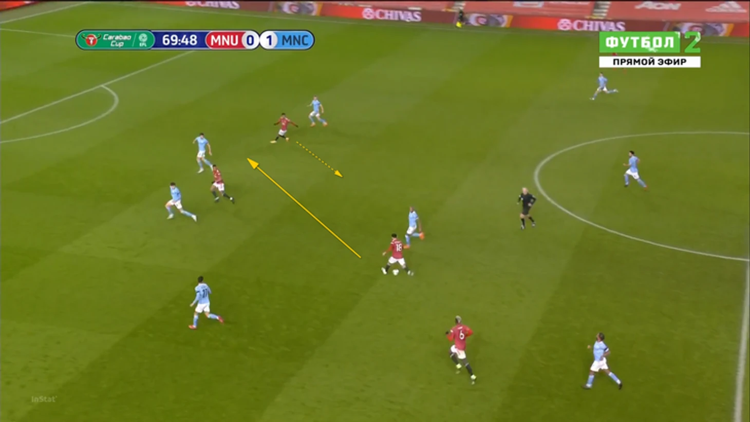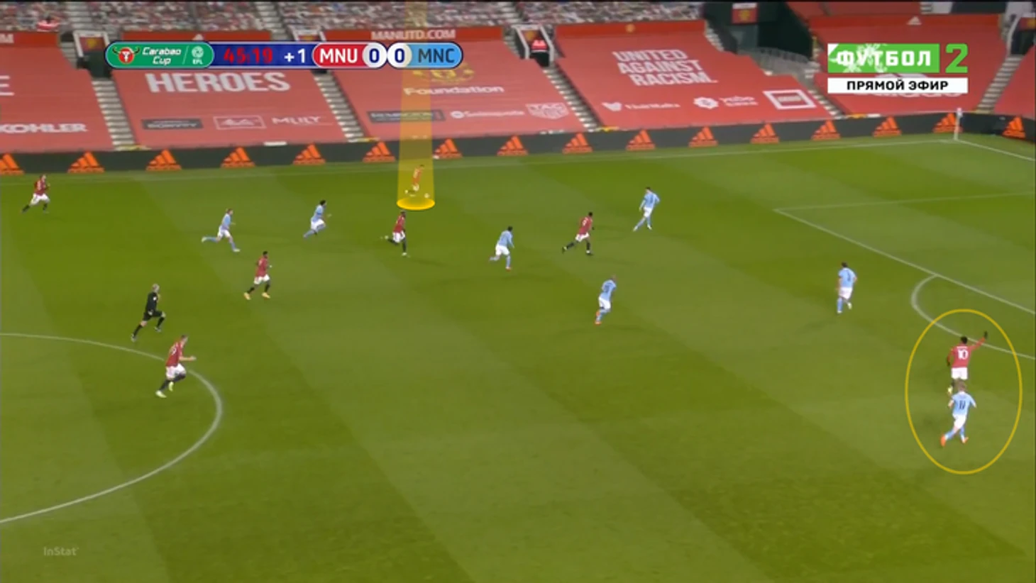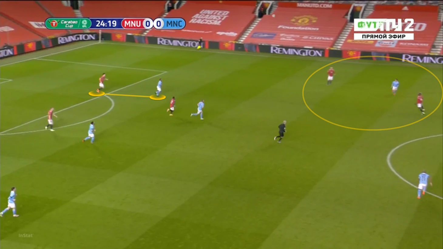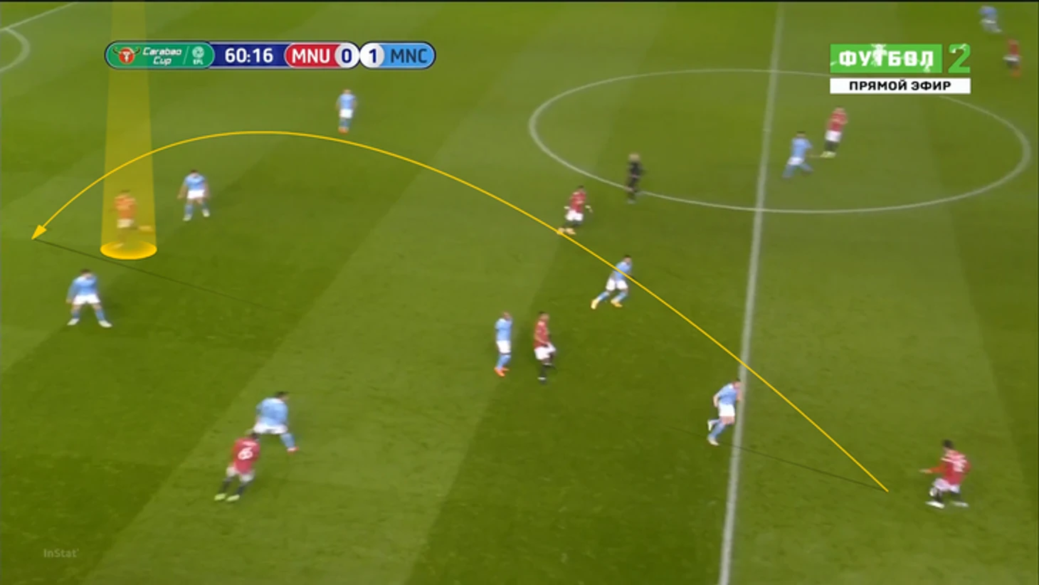 Ключевая идея «МЮ» – отрезать от эпизода минимум одного игрока «Сити» и сократить гостям зону для розыгрыша. С помощью Бруну это получалось особенно успешно.