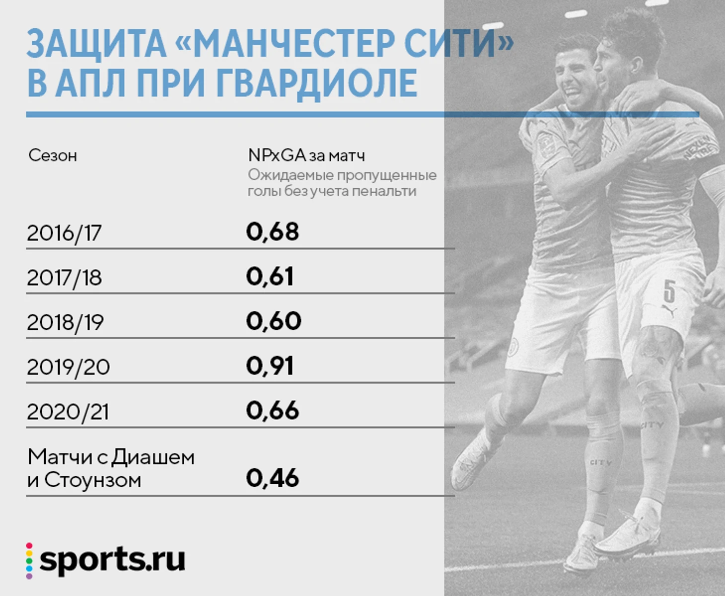 Забавно, что для создания крутой пары защитников Гвардиоле пришлось отказаться от индивидуально лучшего защитника команды (Лапорту мешают и травмы, но четыре матча из этих восьми Эмерик просидел в запасе). Стоунз с Диашем реально хорошо дополняют друг друга. Португалец здорово командует обороной и агрессивно выдвигается из линии, Стоунз – играет на подстраховке и лучше распоряжается мячом. С ними у «Сити» не только лучшая оборона лиги по сезону, но и пугающие показатели по допущенным xG, когда они выходили в паре.