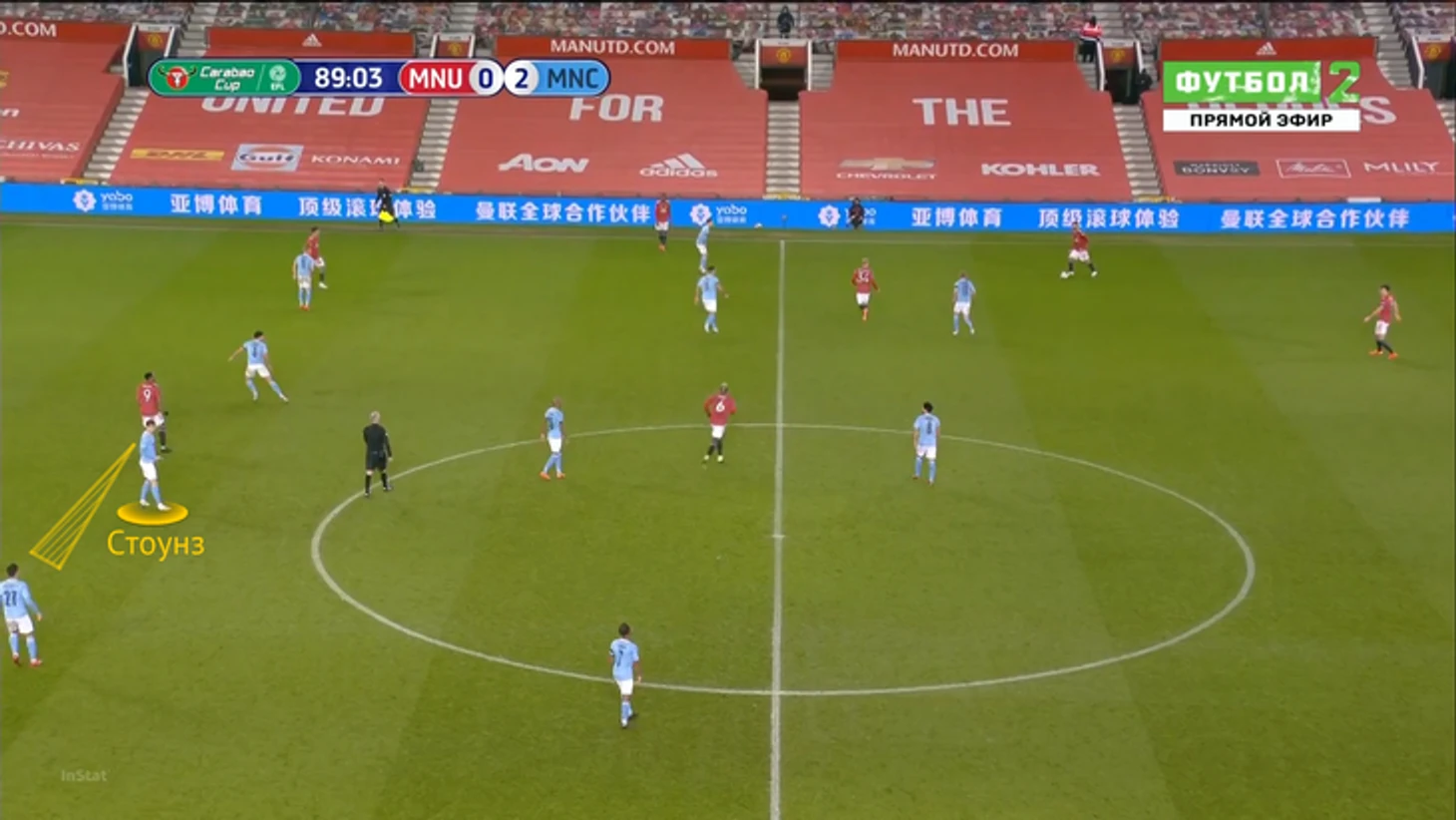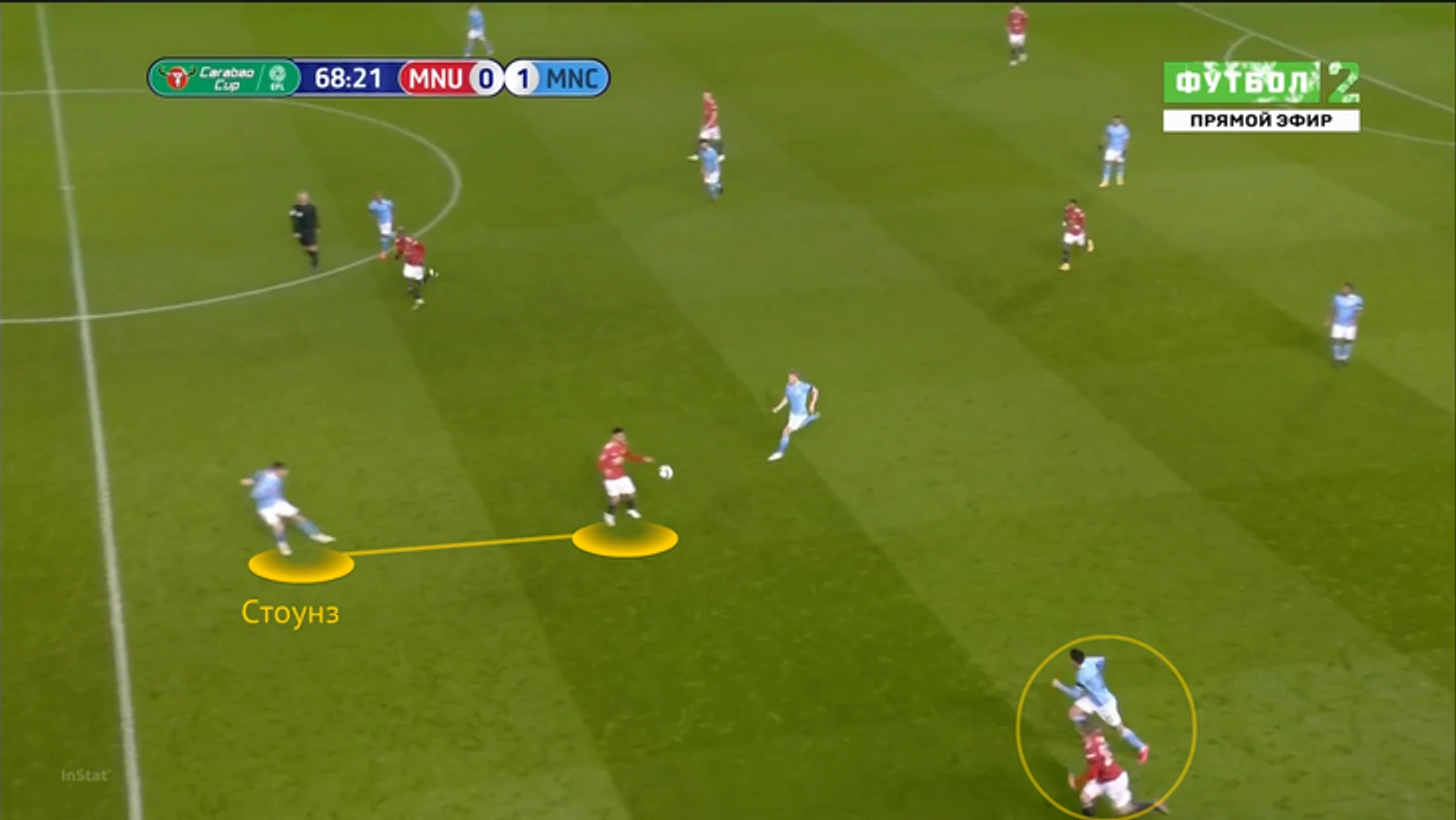 Второй эпизод – уже игра в линии. Стоунз заранее оглядывается направо и замечает, что Рэшфорд готовит рывок под заброс Бруну: