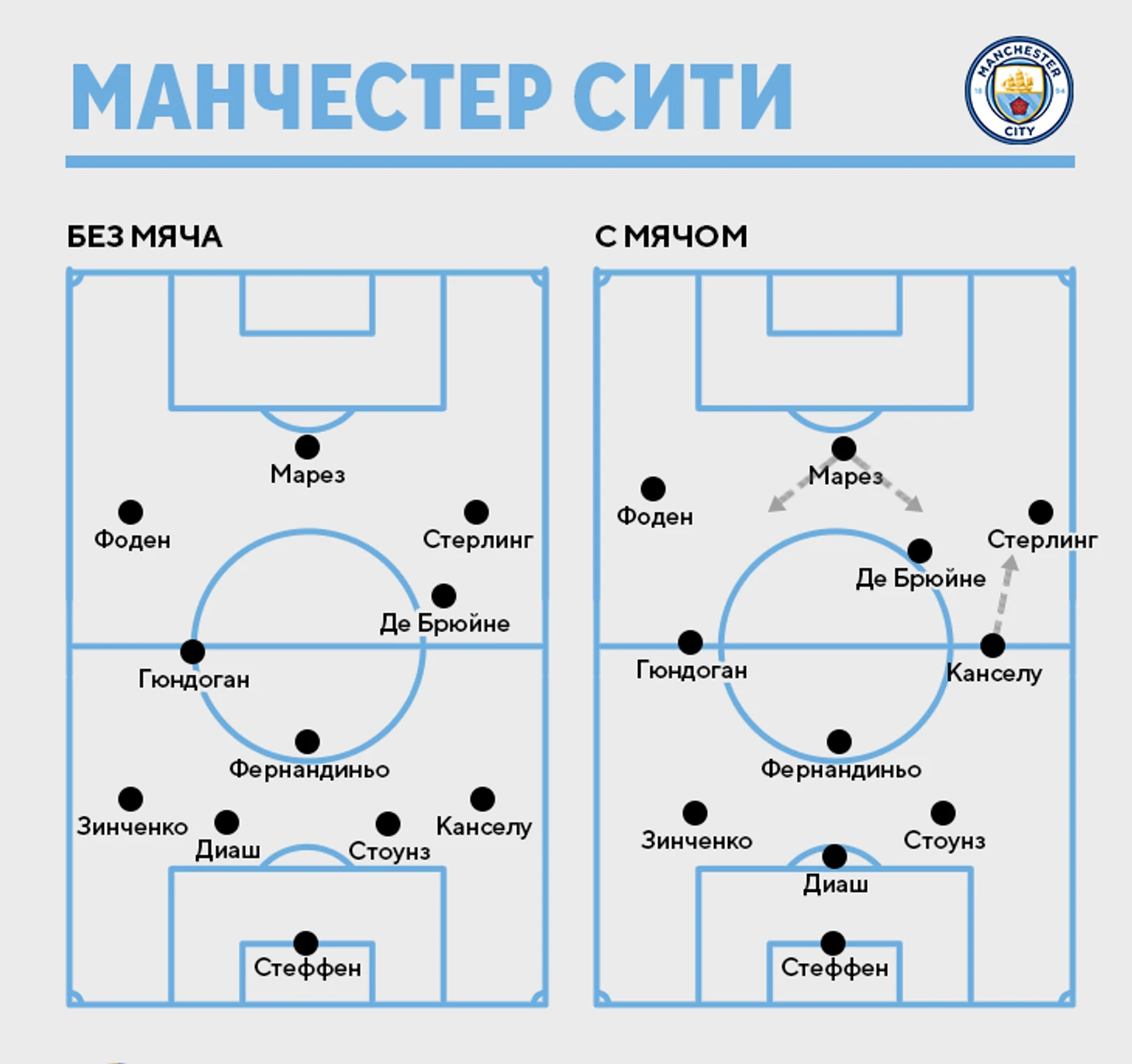 В обороне «Сити» располагался в привычных 4-3-3 (4-1-4-1), в которых на одну линию к Марезу выдвигался либо один из полузащитников (Де Брюйне или Гюндоган), либо один из вингеров (чаще всего Стерлинг, но иногда и Фоден). Когда мяч был у «Сити» (более популярный сценарий), расстановку меняли фулбеки: Зинченко играл как третий центральный защитник, Канселу – смещался в полузащиту. Схему «Сити» в этой фазе можно обозначить как 3-4-3.