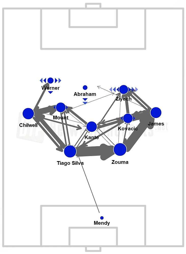 Четверка защитников – главные футболисты в плане игры в пас, Маунт и Ковачич должны слишком глубоко опускаться, потому что Канте не тянет продвижение, даже в таком сценарии перепасовки в центре состояли из поперечных передач, у атакующих игроков нет значимых связей с остальной командой и маленькая вовлеченность.