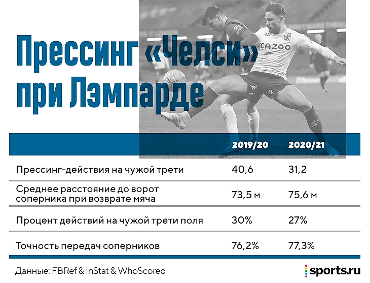 Прессинг-действия на чужой трети подчеркивают само намерение высоко встречать соперника. Здесь нужно держать в уме, что из-за ковидного сдвига футбольного сезона проседают все команды – только «Вилла» на всю АПЛ стала прессинговать больше. Но степень обвала у «Челси» серьезна. Это сильно поменяло картину матча – и вынудило искать новые механизмы (эти поиски отразились и на игре с мячом).