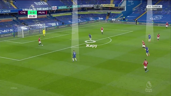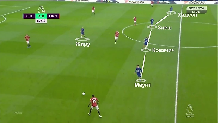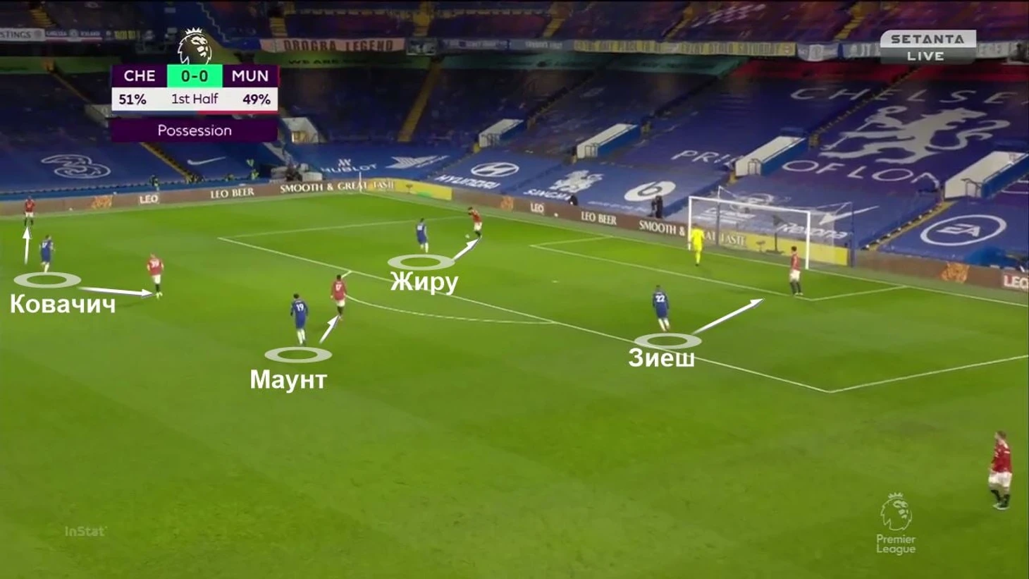 «Челси» тоже применял сдерживающий прессинг, но строился он совсем иначе. Изначально один Оливье Жиру был против пары защитников «Юнайтед» – то есть у «Юнайтед» был свободный игрок при розыгрышах: