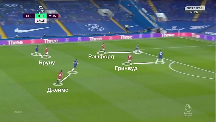 Бонусом шла повышенная безопасность на случай, если «МЮ» проходит давление. Против быстрых Гринвуда, Рэшфорда и Джеймса была четверка, а не тройка (плюс Канте против Бруну).
