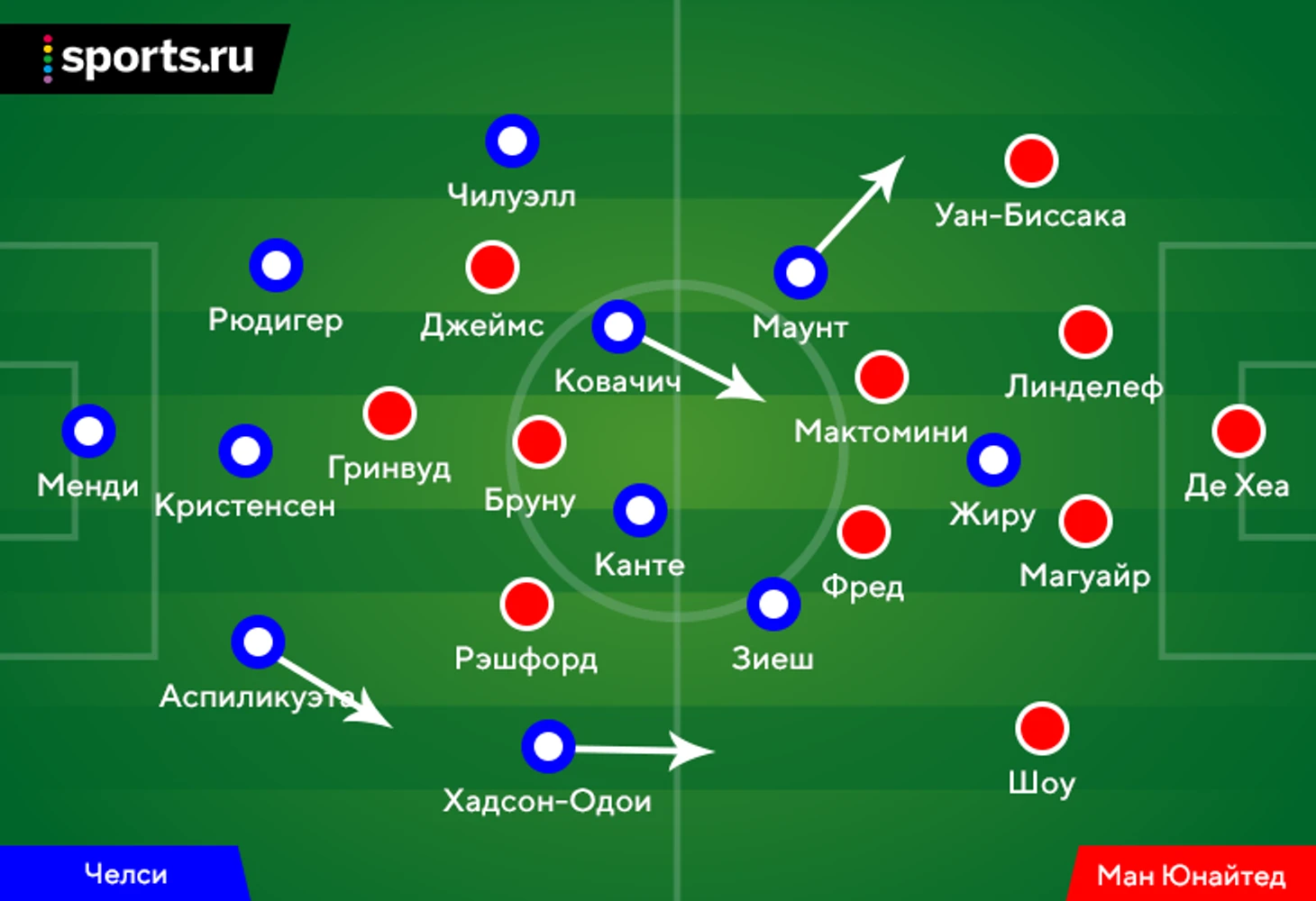 Из-за стартовых схем при розыгрышах «Челси» возникала ситуация 5 (тройка защитников и пара опорников «Челси») против 4 (атакующая четверка «МЮ»).
